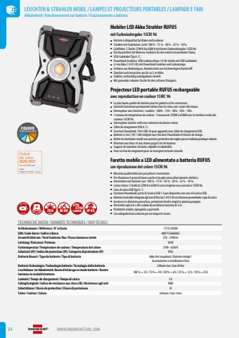 34 WWW.BRENNENSTUHL.COMLEUCHTEN & STRAHLER MOBIL/LAMPES ET PROJECTEURS PORTABLES/LAMPADE E FARIAkkubetrieb/ Fonctionnement sur batterie/ Funzionamento a batteriaMobiler LED Akku Strahler RUFUSmit Farbwiedergabe 15CRI 96%u25a0 H%u00f6chste Lichtqualitat fur Maler und Lackierer.%u25a0 Schalter mit Funktionen: Licht: 100 % - 75 % - 50 % - 25 % - 10 %.%u25a0 Lichtfarbe: 5 Stufen 2700 K bis 6500 K mit bester Farbwiedergabe 15CRI 96.%u25a0 Ein/Ausschalter mit Memory-Funktion f%u00fcr den zuletzt verwendeten Status.%u25a0 USB-Ladekabel Typ A / C.%u25a0 Powerbank-Funktion: USB-Ladeanschluss 1 A f%u00fcr Ger%u00e4te mit USB Ladekabel.%u25a0 Li-lon Akku 7,4 V/5 Ah mit Powerbank Funktion und Ladeanzeige.%u25a0 Geh%u00e4use aus Aludruckguss, Kantenschutz aus hochwertigem Kunststoff.%u25a0 Stossfest und sturzsicher aus bis zu 3 m H%u00f6he.%u25a0 Stabiles, mehrstufig ausklappbares Gestell.%u25a0 Mit passender robuster Tasche f%u00fcr den sicheren Transport.Projecteur LED portable RUFUS rechargeableavec reproduction en couleur 15IRC 96%u25a0 La plus haute qualit%u00e9 de lumi%u00e8re pour les peintres et les vernisseurs.%u25a0 Intensit%u00e9 lumineuse permanente m%u00eame dans les lieux sans source %u00e9lectrique.%u25a0 Interrupteur avec fonctions : Lumi%u00e8re : 100% - 75% - 50% - 25% - 10%.%u25a0 5 niveaux de temp%u00e9rature de couleur : 5 niveaux de 2700K %u00e0 6500K avec le meilleur rendu des couleurs 15CRI 96.%u25a0 Interrupteur marche-arr%u00eat avec m%u00e9moire du dernier statut.%u25a0 C%u00e2ble de chargement USB A / C.%u25a0 Fonction Powerbank : Port USB 1A pour appareils avec c%u00e2ble de chargement USB.%u25a0 Batterie Li-lon 7,4V / 5Ah int%u00e9gr%u00e9e avec fonction Powerbank et t%u00e9moin de charge.%u25a0 Bo%u00eetier en aluminium moul%u00e9 sous pression, protection des angles par un mat%u00e9riau plastique robuste.%u25a0 R%u00e9sistant aux chocs et aux chutes jusqu%u2019%u00e0 3m de hauteur.%u25a0 Support de maintien r%u00e9sistant, r%u00e9glable et rabattable.%u25a0 Avec un %u00e9tui de rangement pour un transport en toute s%u00e9curit%u00e9.Faretto mobile a LED alimentato a batteria RUFUScon riproduzione del colore 15CRI 96%u25a0 Massima qualit%u00e0 della luce per pittori e verniciatori.%u25a0 Per illuminare il posto di lavoro anche in luoghi senza allacciamento elettrico.%u25a0 Interruttore con funzioni: uce: 100 % - 75 % - 50 % - 50 % - 25 % - 10 %.%u25a0 Colore chiaro: 5 livelli da 2700 K a 6500 K con la migliore resa cromatica 15CRI 96.%u25a0 Cavo di carica USB Typ A / C.%u25a0 Funzione Powerbank: porta di ricarica USB 1 A per dispositivi con cavo di ricarica USB.%u25a0 Batteria ricaricabile integrata agli ioni di litio da 7,4 V/5 Ah con funzione powerbank e spia di carica.%u25a0 Involucro in alluminio pressofuso, protezione bordi e angoli in plastica pregiata.%u25a0 Resistente agli urti e alle cadute da un%u2019altezza massima di 3 m.%u25a0 Piedistallo stabile, ripiegabile a pi%u00f9 livelli.%u25a0 Con adeguata borsa robusta per un trasporto sicuro. Li-IonINCLUSIVE USB POWERBANKMAX.25h IK08 -2700LUMEN270IP65TECHNISCHE DATEN / DONN%u00c9ES TECHNIQUES / DATI TECNICIArtikelnummer/ R%u00e9f%u00e9rence / N%u00b0 articolo 1173110300EAN/ Code-barre / Codice a Barre 4007123668465Gesamtlichtstrom/ Total luminous flux/ Flusso luminoso totale 270 - 2700 lm Leistung / Puissance / Potenza 30 WFarbtemperatur/ Temp%u00e9rature de couleur/ Temperatura del colore 2700 - 6500 KSchutzart (IP)/ Indice de protection (IP)/ Categoria di protezione (IP) IP65Batterie Bauart/ Type de batterie / Tipo di batteria Akku fest eingebaut/ Batterie int%u00e9gr%u00e9/ Accumulatore a installazione fissaBatterie Technologie / Technologie batterie / Tecnologia della batteria Lithium-Ion / Ioni di litioLeuchtdauer im Akkubetrieb /Dur%u00e9e d%u2018%u00e9clairage en mode batterie / Durata luminosa in modalit%u00e0 batteria 100 % = 3 h / 75 % = 4 h / 50 % = 6 h / 25 % = 12 h / 10 % = 25 hLadezeit/ Temps de chargement/ Tempo di carica 5 hSchlagfestigkeit/ Indice de r%u00e9sistance aux chocs (IK)/ Resistenza agli urti IK08Schutzklasse / Classe de protection / Classe di protezione IIIFarbe / Couleur/ Colore schwarz/ noir/ neroCOLOURTEMPERATURES