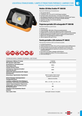 LEUCHTEN & STRAHLER MOBIL/LAMPES ET PROJECTEURS PORTABLES/LAMPADE E FARIAkkubetrieb/ Fonctionnement sur batterie/ Funzionamento a batteriaWWW.BRENNENSTUHL.COM 39Mobiler LED Akku Strahler PF 1000 MAMaximale Lichtleistung im Taschenformat.%u25a0 Mit superheller COB-LED.%u25a0 3 Schaltstufen: 100 %, 50 % und 10 % Licht f%u00fcr l%u00e4ngere Leuchtdauer.%u25a0 Powerbank-Funktion: USB-Ladeanschluss 1 A f%u00fcr Ger%u00e4te mit USB Ladekabel.%u25a0 Mit ausklappbarem Halteb%u00fcgel zum Aufstellen oder Befestigen auf brennenstuhl%u00ae Stativen.%u25a0 Vielseitig einsetzbar im Haus, Garten, bei Camping und Outdoor Aktivit%u00e4ten.%u25a0 Integrierter Li-Ion-Akku 3,7 V/2,5 Ah mit Ladeanzeige.%u25a0 USB-Ladekabel Typ A / C.Projecteur portable LED rechargeable PF 1000 MAPuissance maximale en petit format.%u25a0 LED COB tr%u00e8s claire.%u25a0 3 modes d%u2019%u00e9clairage : 100%, 50% et 10% pour une grande autonomie.%u25a0 Fonction Powerbank : Port USB 1A pour appareils avec c%u00e2ble de chargement USB.%u25a0 Possibilit%u00e9 de fixer sur les pieds t%u00e9lescopiques brennenstuhl%u00ae gr%u00e2ce au support de maintien rabattable.%u25a0 Utilisation polyvalente pour le domicile, le jardin, le camping et les activit%u00e9s de plein air.%u25a0 Batterie Li-Ion 3,7V/2,5Ah int%u00e9gr%u00e9e avec t%u00e9moin de charge.%u25a0 C%u00e2ble de chargement USB, type A/C fourni.Faretto portatile a LED a batteria PF 1000 MMassimo flusso luminoso utile in un formato tascabile.%u25a0 Con COB-LED superluminoso.%u25a0 3 livelli di accensione: luce al 100 %, 50 % e al 10 % per una durata superiore dell%u2019illuminazione.%u25a0 Funzione Powerbank: porta di ricarica USB 1 A per dispositivi con cavo di ricarica USB.%u25a0 Con staffa di supporto pieghevole regolabile per la posizione eretta o per il fissaggio su cavalletti brennenstuhl%u00ae.%u25a0 Uso versatile in casa, giardino, campeggio e attivit%u00e0 all%u2019aperto.%u25a0 Batteria ricaricabile agli ioni di litio 3,7 V/2,5 Ah con indicatore di carica.%u25a0 Cavo di carica USB Typ A / C.TECHNISCHE DATEN / DONN%u00c9ES TECHNIQUES / DATI TECNICIArtikelnummer/ R%u00e9f%u00e9rence / N%u00b0 articolo 1173090100EAN/ Code-barre / Codice a Barre 4007123668397Gesamtlichtstrom/ Flux lumineux total/ Flusso luminoso totale 1000 lmLeistung / Puissance / Potenza 8.5 WFarbtemperatur/ Temp%u00e9rature de couleur/ Temperatura del colore 6500 KSchutzart (IP)/ Indice de protection (IP)/ Categoria di protezione (IP) IP65Batterie Bauart/ Type de batterie / Tipo di batteria Akku fest eingebaut/ Batterie int%u00e9gr%u00e9/ Accumulatore a installazione fissaBatterie Technologie / Technologie batterie / Tecnologia della batteria Lithium-Ion / Ioni di litioLeuchtdauer im Akkubetrieb / Dur%u00e9e d%u2018%u00e9clairage en mode batterie / Durata luminosa in modalit%u00e0 batteria 100 % = 3 h / 50 % = 6 h / 10 % = 13 hLadezeit/ Temps de chargement/ Tempo di carica 3 hSchlagfestigkeit/ Indice de r%u00e9sistance aux chocs (IK)/ Resistenza agli urti IK08Schutzklasse / Classe de protection / Classe di protezione IIIFarbe / Couleur/ Colore schwarz/gelb/ noir/jaune/ nero/gialloaIP65 Li-IonINCLUSIVEUSB POWERBANKMAX.13h1000IK08 LUMEN