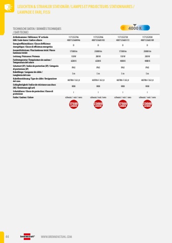 LEUCHTEN & STRAHLER STATION%u00c4R /LAMPES ET PROJECTEURS STATIONNAIRES/LAMPADE E FARI, FISSI44 WWW.BRENNENSTUHL.COMTECHNISCHE DATEN / DONN%u00c9ES TECHNIQUES / DATI TECNICI4000KArtikelnummer/ R%u00e9f%u00e9rence / N%u00b0 articolo 1171252746 1171252946 1171252730 1171252930EAN/ Code-barre / Codice a Barre 4007123684946 4007123685103 4007123685172 4007123685189Energieeffizienzklasse / Classe d%u2019efficience %u00e9nerg%u00e9tique / Classe di efficienza energetica D D D DGesamtlichtstrom/ Flux lumineux total/ Flusso luminoso totale 17500 lm 23000 lm 17500 lm 23000 lmLeistung / Puissance / Potenza 150 W 200 W 150 W 200 WFarbtemperatur/ Temp%u00e9rature de couleur/ Temperatura del colore 6500 K 6500 K 4000 K 4000 KSchutzart (IP)/ Indice de protection (IP)/ Categoria di protezione (IP) IP65 IP65 IP65 IP65Kabell%u00e4nge / Longueur de c%u00e2ble / Lunghezza del cavo 5 m 5 m 5 m 5 mKabelbezeichnung / Type de c%u00e2ble / Designazione del cavo H07RN-F 3G1,0 H07RN-F 3G1,0 H07RN-F 3G1,0 H07RN-F 3G1,0Schlagfestigkeit/ Indice de r%u00e9sistance aux chocs (IK)/ Resistenza agli urti IK08 IK08 IK08 IK08Schutzklasse / Classe de protection / Classe di protezione I I I IFarbe / Couleur/ Colore schwarz/ noir/ nero schwarz/ noir/ nero schwarz/ noir/ nero schwarz/ noir/ nero17500LUMEN23000LUMEN17500LUMEN23000LUMEN