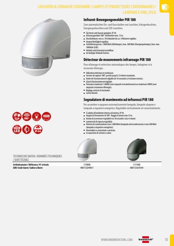 WWW.BRENNENSTUHL.COM 55LEUCHTEN & STRAHLER STATION%u00c4R /LAMPES ET PROJECTEURS STATIONNAIRES/LAMPADE E FARI, FISSIInfrarot-Bewegungsmelder PIR 180Zum automatischen Ein- und Ausschalten von Leuchten, Halogenleuchten, Energiesparleuchten und LED-Leuchten.%u25a0 F%u00fcr Innen und Aussen geeignet, IP 44.%u25a0 Erfassungswinkel 180%u00b0. Reichweite max. 12 m.%u25a0 Einschaltdauer von ca. 10 Sekunden bis ca. 4 Minuten regelbar.%u25a0 Ansprechhelligkeit regelbar.%u25a0 Schaltleistung max. 1.000 Watt (Gl%u00fchlampe), max. 300 Watt (Energiesparlampe), bzw. max. 100 Watt (LED).%u25a0 Vertikal und horizontal verstellbar.%u25a0 Im farbigen Verkaufs-Karton.D%u00e9tecteur de mouvements infrarouge PIR 180Pour allumage et extinction automatiques des lampes, halog%u00e8nes et %u00e0 %u00e9conomie d%u2019%u00e9nergie.%u25a0 Utilisation int%u00e9rieure et ext%u00e9rieure.%u25a0 Secteur de capture 180%u00b0, port%u00e9e jusqu%u2019%u00e0 12 m%u00e8tres maximum.%u25a0 Dur%u00e9e de fonctionnement r%u00e9glable de 10 secondes %u00e0 4 minutes environ.%u25a0 Clart%u00e9 d%u2019enclenchement r%u00e9glable.%u25a0 Puissance maximum 1.000W (avec ampoule %u00e0 incandescence) ou maximum 300W (avec ampoule %u00e0 %u00e9conomie d%u2019%u00e9nergie).%u25a0 R%u00e9glage vertical et horizontal.%u25a0 Carton illustr%u00e9.Segnalatore di movimento ad infrarossi PIR 180Per accendere e spegnere automaticamente lampade, lampade alogene e lampade a risparmio energetico. Regolabile verticalmente ed orizzontalmente.%u25a0 Si adatta all%u2019ambiente interno ed esterno, IP 44.%u25a0 Angolo di rilevamento di 180%u00b0. Raggio d%u2019azione max 12 m.%u25a0 Durata di accensione regolabile tra 10 secondi e circa 4 minuti%u25a0 Luminosit%u00e0 di risposta regolabile.%u25a0 Potenza di commutazione max 1.000 Watt (lampada ad incandescenza) e max 300 Watt (lampada a risparmio energetico).%u25a0 Orientabile in orizzontale e verticale.%u25a0 In espositore di cartone a colori.12mMAX. 180%u00b0 MAX. 1000 WMAX. 300 W100WLEDMAX.IP44TECHNISCHE DATEN / DONN%u00c9ES TECHNIQUES / DATI TECNICIArtikelnummer/ R%u00e9f%u00e9rence / N%u00b0 articolo 1170900 1171900EAN/ Code-barre / Codice a Barre 4007123249817 4007123619344