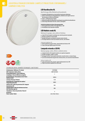 56 WWW.BRENNENSTUHL.COMLEUCHTEN & STRAHLER STATION%u00c4R /LAMPES ET PROJECTEURS STATIONNAIRES/LAMPADE E FARI, FISSILED Rundleuchte RLIdeal f%u00fcr Garage, Keller, Werkstatt und Aussenbereich.%u25a0 Kompakte LED Rundleuchte aus Kunststoff mit transluzenter Abdeckung.%u25a0 Ideal zur Ausleuchtung von Eingangsbereichen, Einfahrten oder Carports sowie zur Abschreckung vor Einbruch und Diebstahl.%u25a0 Decken- und Wandmontage m%u00f6glich.%u25a0 Bedienerfreundliche Montage durch aussenliegende wasserdichte Anschlussklemme.%u25a0 Extrem lange Lebensdauer der LEDs, stossfest, wartungsfrei.Zus%u00e4tzlich bei Model mit Infrarot-Bewegungsmelder:%u25a0 Erfassungsbereich bis 8 Meter, Erfassungswinkel ca. 100%u00b0.%u25a0 Einschaltdauer bis 60 Sekunden einstellbar.LED Hublots ronds RLId%u00e9ale pour les garages, caves, ateliers et l%u2019ext%u00e9rieur.%u25a0 Lampe LED rond compacte en plastique avec cache de protection translucide.%u25a0 Montage au plafond et mural possible.%u25a0 Montage facile gr%u00e2ce %u00e0 une borne de connexion externe %u00e9tanche.%u25a0 Tr%u00e8s longue dur%u00e9e de vie des LED, r%u00e9sistantes aux chocs, sans entretien.En plus pour le mod%u00e8le avec PIR%u00a0:%u25a0 Port%u00e9e de d%u00e9tection jusqu%u2019%u00e0 8 m%u00e8tres, angle de d%u00e9tection d%u2019environ 100%u00b0.%u25a0 Temps d%u2019allumage r%u00e9glable jusqu%u2019%u00e0 60 secondes.Lampada rotonda a LED RLIdeale per garage, cantine, officine e ambiente esterno.%u25a0 Lampada rotondo a LED compatta in plastica con copertura trasparente.%u25a0 Possibile montaggio a soffitto o a parete.%u25a0 Montaggio facile per l%u2019utente grazie al terminale a morsetto esterno e a tenuta d%u2019acqua.%u25a0 Ciclo di vita estremamente lungo dei LED, resistenza all%u2019urto, non necessita di manuntenzione.Inoltre per il modello con PIR:%u25a0 Campo di rilevamento fino a 8 metri, angolo di rilevamento di circa 100%u00b0.%u25a0 Tempo di accensione regolabile fino a 60 secondi. IP651680LUMENTECHNISCHE DATEN / DONN%u00c9ES TECHNIQUES / DATI TECNICIArtikelnummer/ R%u00e9f%u00e9rence / N%u00b0 articolo 1270790900EAN/ Code-barre / Codice a Barre 4007123674282Energieeffizienzklasse / Classe d%u2019efficience %u00e9nerg%u00e9tique / Classe di efficienza energetica FGesamtlichtstrom/ Flux lumineux total/ Flusso luminoso totale 1680 lmLeistung / Puissance / Potenza 15 WFarbtemperatur/ Temp%u00e9rature de couleur/ Temperatura del colore 4000 KSchutzart (IP)/ Indice de protection (IP)/ Categoria di protezione (IP) IP65Schlagfestigkeit/ Indice de r%u00e9sistance aux chocs (IK)/ Resistenza agli urti IK06Schutzklasse / Classe de protection / Classe di protezione IIFarbe / Couleur/ Colore weiss/ blanc/ bianco