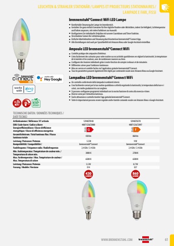 TECHNISCHE DATEN / DONN%u00c9ES TECHNIQUES / DATI TECNICIArtikelnummer/ R%u00e9f%u00e9rence / N%u00b0 articolo 1294870140 1294870270EAN/ Code-barre / Codice a Barre 4007123672080 4007123672097Energieeffizienzklasse / Classe d%u2019efficience %u00e9nerg%u00e9tique / Classe di efficienza energeticaGesamtlichtstrom / Total luminous flux / Flusso luminoso totale 430 lm 860 lmLeistung / Puissance / Potenza 5.5 W 9 WKompatibilit%u00e4t / Compatibilit%u00e9 / brennenstuhl%u00aeConnect brennenstuhl%u00aeConnectFunkfrequenz / Fr%u00e9quence radio / Radiofrequenza 2,4 GHz / 2.4 GHz 2,4 GHz / 2.4 GHzMin. Farbtemperatur / Temp%u00e9rature de couleur min. / Temperatura di colore min. 3000 K 2700 KMax. Farbtemperatur / Max. Temp%u00e9rature de couleur / Max. Temperatura di colore 6500 K 6500 KLeistung / Puissance / Potenza 5.5 W 8.7 WFassung / Mod%u00e8le / Versione E14 E27430LUMEN860LUMENLEUCHTEN & STRAHLER STATION%u00c4R /LAMPES ET PROJECTEURS STATIONNAIRES/LAMPADE E FARI, FISSIWWW.BRENNENSTUHL.COM 61brennenstuhl%u00aeConnect WiFi LED Lampe%u25a0 Komfortable Steuerung der Lampe im Innenbereich.%u25a0 Gestalten Sie ganz einfach Szenarien f%u00fcr Ihre t%u00e4gliche Routine oder Aktivit%u00e4ten, indem Sie Helligkeit, Lichttemperatur und Farben anpassen, mit vielen Farbt%u00f6nen zur Auswahl.%u25a0 Konfigurieren Sie individuelle Zeitpl%u00e4ne mit unserer Countdown und Timer Funktion. %u25a0 Verschiedene Szenen f%u00fcr Lichtatmosph%u00e4re.%u25a0 Einfache Inbetriebnahme und Steuerung durch kostenlose brennenstuhl%u00aeConnect App.%u25a0 Alle Einstellungen sind auch per Sprachbefehl mit Amazon Alexa oder Google Assistant einstellbar.Ampoule LED brennenstuhl%u00aeConnect WiFi%u25a0 Contr%u00f4le pratique des ampoules d%u2019int%u00e9rieur.%u25a0 Cr%u00e9ez facilement des sc%u00e9narios pour votre routine ou vos activit%u00e9s quotidiennes en r%u00e9glant la luminosit%u00e9, la temp%u00e9rature de la lumi%u00e8re et les couleurs, avec de nombreuses nuances au choix.%u25a0 Configurez des horaires individuels gr%u00e2ce %u00e0 notre fonction de compte %u00e0 rebours et de minuterie. %u25a0 Diff%u00e9rentes sc%u00e8nes pour l%u2019ambiance lumineuse.%u25a0 Mise en service et contr%u00f4le faciles via l%u2019application gratuite brennenstuhl%u00aeConnect.%u25a0 Tous les param%u00e8tres peuvent %u00e9galement %u00eatre r%u00e9gl%u00e9s par commande vocale avec Amazon Alexa ou Google Assistant.Lampadina LED brennenstuhl%u00aeConnect WiFi%u25a0 Un controllo confortevole della lampada in ambienti interni.%u25a0 Crea facilmente scenari per la tua routine quotidiana o attivit%u00e0 regolando la luminosit%u00e0, la temperatura della luce e i colori, con molte gradazioni tra cui scegliere.%u25a0 Si possono configurare programmi individuali con la nostra funzione di conto alla rovescia e timer. %u25a0 Diverse scene per l%u2019atmosfera luminosa.%u25a0 Facile attivazione e controllo tramite l%u2019app gratuita brennenstuhl%u00aeConnect.%u25a0 Tutte le impostazioni possono essere regolate anche tramite comando vocale con Amazon Alexa o Google Assistant. 2,4GHz0% 100%