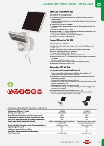 WWW.BRENNENSTUHL.COM 69SOLAR LEUCHTEN /LAMPES SOLAIRES/LAMPADE SOLARISolar LED-Strahler SOL 800mit Infrarot-Bewegungsmelder%u25a0 Solarmodul unabh%u00e4ngig von dem Strahler auf der Sonnenseite montierbar (inkl. 4,75 m Verbindungskabel).%u25a0 Bedienerfreundliche Montage. Leuchte- bzw. Strahlerkopf wird nach der Montage einfach auf die Halterung gesteckt.%u25a0 Strahler horizontal und vertikal schwenkbar.%u25a0 Schwenkbarer Infrarot-Bewegungsmelder mit max. 180%u00b0 Erfassungswinkel und max. 12 m Reichweite.%u25a0 Einschaltdauer regelbar bis max. ca. 1 Minute.%u25a0 Inklusive Li-Ion Akku 3,7 V/3,6 Ah mit eingebautem %u00dcberladungs- und Tiefentladungsschutz.%u25a0 Leuchtdauer bei voll geladenem Akku ca. 3 Stunden.%u25a0 Ladem%u00f6glichkeit f%u00fcr Schnellladung %u00fcber Netzteil (nicht enthalten).%u25a0 Solarmodul: 200 x 160 mm - Solarleistung 2 Wp.Lampe LED solaire SOL 800Pour une utilisation %u00e0 l%u2019ext%u00e9rieur.%u25a0 Module solaire ind%u00e9pendant du projecteur, pouvant %u00eatre mont%u00e9 c%u00f4t%u00e9 soleil (fourni avec un c%u00e2ble de 4,75m).%u25a0 Fixation et branchement faciles. Le projecteur se fixe ais%u00e9ment apr%u00e8s le montage.%u25a0 Projecteur pivotant horizontalement et verticalement.%u25a0 Secteur de capture 180%u00b0, port%u00e9e jusqu%u2019%u00e0 12 m%u00e8tres.%u25a0 Dur%u00e9e de fonctionnement r%u00e9glable jusqu%u2019%u00e0 maximum 1 minute environ.%u25a0 Fournie avec batterie Li-Ion 3,7 V/3,6 Ah avec protection int%u00e9gr%u00e9e contre les surcharges et les sous-charges.%u25a0 Autonomie : environ 3 heures en pleine charge.%u25a0 Pour un chargement rapide : chargement possible via un chargeur (non fourni).%u25a0 Module solaire: 200 x 160mm - puissance 2 Wp.Faro solare LED SOL 800con segnalatore di movimento ad infrarossi%u25a0 Montare il pannello Solare indipendentemente dal Faretto sul lato soleggiato (per il collegamento usare 4,75 metri di cavo incluso nel imballo).%u25a0 Montaggio facile. La testa della lampada o del faretto vengono semplicemente inseriti nel supporto dopo il montaggio.%u25a0 Faretto orientabile sia orizzontalmente che verticalmente.%u25a0 Segnalatore di movimento a infrarossi orientabile con angolo di rilevamento massimo di 180%u00b0 e raggio d%u2019azione massimo di 12 m.%u25a0 Durata di accensione regolabile fino a circa 1 minuto max.%u25a0 Inclusa batteria ricaricabile agli ioni di litio da 3,7 V/3,6 Ah, con protezione integrata contro sovraccarico/scarico completo.%u25a0 Durata di illuminazione a batteria completamente carica: ca. 3 ore.%u25a0 Possibilit%u00e0 di carica tramite alimentatore per carica veloce (alimentatore non fornito).%u25a0 Dimensione del pannello: 200 x 160 mm / Solar Power: 2 Wp.12mMAX. 180%u00b0 Li-IonINCLUSIVE 400LUMEN IP44GREEN ENERGYGREEN ENERGYTECHNISCHE DATEN / DONN%u00c9ES TECHNIQUES / DATI TECNICIArtikelnummer/ R%u00e9f%u00e9rence / N%u00b0 articolo 1170850010 1170950010EAN/ Code-barre / Codice a Barre 4007123646418 4007123646425Gesamtlichtstrom/ Flux lumineux total/ Flusso luminoso totale 400 lm 400 lmFarbtemperatur/ Temp%u00e9rature de couleur/ Temperatura del colore 6000 K 6000 KSchutzart (IP)/ Indice de protection (IP)/ Categoria di protezione (IP) IP44 IP44Batterie Bauart/ Type de batterie / Tipo di batteria Akku fest eingebaut/ Batterie int%u00e9gr%u00e9/ Accumulatore a installazione fissaAkku fest eingebaut/ Batterie int%u00e9gr%u00e9/ Accumulatore a installazione fissaBatterie Technologie / Technologie batterie / Tecnologia della batteria Lithium-Ion / Ioni di litio Lithium-Ion / Ioni di litioKapazit%u00e4t/ Capacit%u00e9 / Capacit%u00e0 3.6 Ah 3.6 AhLeuchtdauer/ Autonomie / Durata della luce 3 h 3 hSchutzklasse / Classe de protection / Classe di protezione III IIIFarbe / Couleur/ Colore weiss/ blanc/ bianco schwarz/ noir/ nero