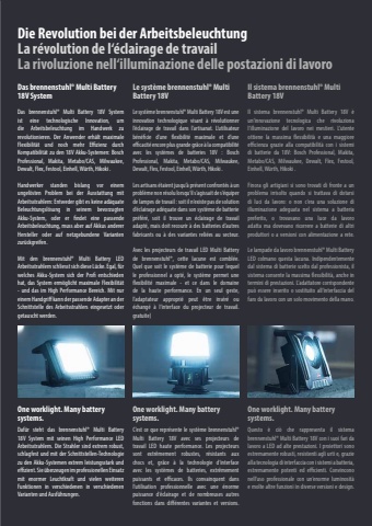 Das brennenstuhl%u00ae Multi Battery 18V System Das brennenstuhl%u00ae Multi Battery 18V System ist eine technologische Innovation, um die Arbeitsbeleuchtung im Handwerk zu revolutionieren. Der Anwender erh%u00e4lt maximale Flexibilit%u00e4t und noch mehr Effizienz durch Kompatibilit%u00e4t zu den 18V Akku-Systemen: Bosch Professional, Makita, Metabo/CAS, Milwaukee, Dewalt, Flex, Festool, Einhell, W%u00fcrth, Hikoki .Handwerker standen bislang vor einem ungel%u00f6sten Problem bei der Ausstattung mit Arbeitsstrahlern: Entweder gibt es keine ad%u00e4quate Beleuchtungsl%u00f6sung in seinem bevorzugten Akku-System, oder er findet eine passende Arbeitsbeleuchtung, muss aber auf Akkus anderer Hersteller oder auf netzgebundene Varianten zur%u00fcckgreifen.Mit den brennenstuhl%u00ae Multi Battery LED Arbeitsstrahlern schliesst sich diese L%u00fccke. Egal, f%u00fcr welches Akku-System sich der Profi entschieden hat, das System erm%u00f6glicht maximale Flexibilit%u00e4t - und das im High Performance Bereich. Mit nur einem Handgriff kann der passende Adapter an der Schnittstelle des Arbeitsstrahlers eingesetzt oder getauscht werden.One worklight. Many battery systems. Daf%u00fcr steht das brennenstuhl%u00ae Multi Battery 18V System mit seinen High Performance LED Arbeitsstrahlern. Die Strahler sind extrem robust, schlagfest und mit der Schnittstellen-Technologie zu den Akku-Systemen extrem leistungsstark und effizient. Sie %u00fcberzeugen im professionellen Einsatz mit enormer Leuchtkraft und vielen weiteren Funktionen in verschiedenen in verschiedenen Varianten und Ausf%u00fchrungen.Die Revolution bei der ArbeitsbeleuchtungLa r%u00e9volution de l%u2018%u00e9clairage de travailLa rivoluzione nell%u2018illuminazione delle postazioni di lavoroLe syst%u00e8me brennenstuhl%u00ae Multi Battery 18V Le syst%u00e8me brennenstuhl%u00ae Multi Battery 18V est une innovation technologique visant %u00e0 r%u00e9volutionner l%u2018%u00e9clairage de travail dans l%u2018artisanat. L%u2018utilisateur b%u00e9n%u00e9ficie d%u2018une flexibilit%u00e9 maximale et d%u2018une efficacit%u00e9 encore plus grande gr%u00e2ce %u00e0 la compatibilit%u00e9 avec les syst%u00e8mes de batteries 18V : Bosch Professional, Makita, Metabo/CAS, Milwaukee, Dewalt, Flex, Festool, Einhell, W%u00fcrth, Hikoki .Les artisans %u00e9taient jusqu%u2018%u00e0 pr%u00e9sent confront%u00e9s %u00e0 un probl%u00e8me non r%u00e9solu lorsqu%u2018il s%u2018agissait de s%u2018%u00e9quiper de lampes de travail : soit il n%u2018existe pas de solution d%u2018%u00e9clairage ad%u00e9quate dans son syst%u00e8me de batterie pr%u00e9f%u00e9r%u00e9, soit il trouve un %u00e9clairage de travail adapt%u00e9, mais doit recourir %u00e0 des batteries d%u2018autres fabricants ou %u00e0 des variantes reli%u00e9es au secteur.Avec les projecteurs de travail LED Multi Battery de brennenstuhl%u00ae, cette lacune est combl%u00e9e. Quel que soit le syst%u00e8me de batterie pour lequel le professionnel a opt%u00e9, le syst%u00e8me permet une flexibilit%u00e9 maximale - et ce dans le domaine de la haute performance. En un seul geste, l%u2018adaptateur appropri%u00e9 peut %u00eatre ins%u00e9r%u00e9 ou %u00e9chang%u00e9 %u00e0 l%u2018interface du projecteur de travail.gratuite)One worklight. Many battery systems. C%u2018est ce que repr%u00e9sente le syst%u00e8me brennenstuhl%u00ae Multi Battery 18V avec ses projecteurs de travail LED haute performance. Les projecteurs sont extr%u00eamement robustes, r%u00e9sistants aux chocs et, gr%u00e2ce %u00e0 la technologie d%u2018interface avec les syst%u00e8mes de batteries, extr%u00eamement puissants et efficaces. Ils convainquent dans l%u2018utilisation professionnelle avec une %u00e9norme puissance d%u2018%u00e9clairage et de nombreuses autres fonctions dans diff%u00e9rentes variantes et versions.Il sistema brennenstuhl%u00ae Multi Battery 18V Il sistema brennenstuhl%u00ae Multi Battery 18V %u00e8 un%u2018innovazione tecnologica che rivoluziona l%u2018illuminazione del lavoro nei mestieri. L%u2018utente ottiene la massima flessibilit%u00e0 e una maggiore efficienza grazie alla compatibilit%u00e0 con i sistemi di batterie da 18V: Bosch Professional, Makita, Metabo/CAS, Milwaukee, Dewalt, Flex, Festool, Einhell, W%u00fcrth, Hikoki .Finora gli artigiani si sono trovati di fronte a un problema irrisolto quando si trattava di dotarsi di luci da lavoro: o non c%u2018era una soluzione di illuminazione adeguata nel sistema a batteria preferito, o trovavano una luce da lavoro adatta ma dovevano ricorrere a batterie di altri produttori o a versioni con alimentazione a rete.Le lampade da lavoro brennenstuhl%u00ae Multi Battery LED colmano questa lacuna. Indipendentemente dal sistema di batterie scelto dal professionista, il sistema consente la massima flessibilit%u00e0, anche in termini di prestazioni. L%u2018adattatore corrispondente pu%u00f2 essere inserito o sostituito all%u2018interfaccia del faro da lavoro con un solo movimento della mano.One worklight. Many battery systems. Questo %u00e8 ci%u00f2 che rappresenta il sistema brennenstuhl%u00ae Multi Battery 18V con i suoi fari da lavoro a LED ad alte prestazioni. I proiettori sono estremamente robusti, resistenti agli urti e, grazie alla tecnologia di interfaccia con i sistemi a batteria, estremamente potenti ed efficienti. Convincono nell%u2018uso professionale con un%u2018enorme luminosit%u00e0 e molte altre funzioni in diverse versioni e design.