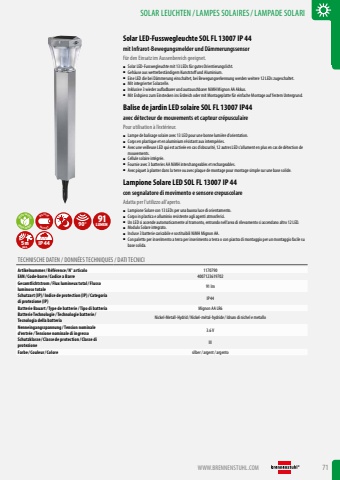 WWW.BRENNENSTUHL.COM 71Solar LED-Fusswegleuchte SOL FL 13007 IP 44mit Infrarot-Bewegungsmelder und D%u00e4mmerungssensorF%u00fcr den Einsatz im Aussenbereich geeignet.%u25a0 Solar LED-Fusswegleuchte mit 13 LEDs f%u00fcr gutes Orientierungslicht.%u25a0 Geh%u00e4use aus wetterbest%u00e4ndigem Kunststoff und Aluminium.%u25a0 Eine LED die bei D%u00e4mmerung einschaltet, bei Bewegungserkennung werden weitere 12 LEDs zugeschaltet.%u25a0 Mit integrierter Solarzelle.%u25a0 Inklusive 3 wieder aufladbarer und austauschbarer NiMH Mignon AA Akkus.%u25a0 Mit Erdspiess zum Einstecken ins Erdreich oder mit Montageplatte f%u00fcr einfache Montage auf festem Untergrund.Balise de jardin LED solaire SOL FL 13007 IP44avec d%u00e9tecteur de mouvements et capteur cr%u00e9pusculairePour utilisation %u00e0 l%u2019ext%u00e9rieur.%u25a0 Lampe de balisage solaire avec 13 LED pour une bonne lumi%u00e8re d%u2019orientation.%u25a0 Corps en plastique et en aluminium r%u00e9sistant aux intemp%u00e9ries.%u25a0 Avec une veilleuse LED qui est activ%u00e9e en cas d%u2019obscurit%u00e9, 12 autres LED s%u2019allument en plus en cas de d%u00e9tection de mouvements.%u25a0 Cellule solaire int%u00e9gr%u00e9e.%u25a0 Fournie avec 3 batteries AA NiMH interchangeables et rechargeables.%u25a0 Avec piquet %u00e0 planter dans la terre ou avec plaque de montage pour montage simple sur une base solide.Lampione Solare LED SOL FL 13007 IP 44con segnalatore di movimento e sensore crepuscolareAdatta per l%u2019utilizzo all%u2019aperto.%u25a0 Lampione Solare con 13 LEDs per una buona luce di orientamento.%u25a0 Corpo in plastica e alluminio resistente agli agenti atmosferici.%u25a0 Un LED si accende automaticamente al tramonto, entrando nell%u2019area di rilevamento si accendano altro 12 LED.%u25a0 Modulo Solare integrato.%u25a0 Incluse 3 batterie caricabile e sostituibili NiMH Mignon AA.%u25a0 Con paletto per inserimento a terra per inserimento a terra o con piastra di montaggio per un montaggio facile su base solida.GREEN ENERGYGREEN ENERGYBATTERYINCLUSIVE90%u00b0 91LUMEN5mMAX. IP44TECHNISCHE DATEN / DONN%u00c9ES TECHNIQUES / DATI TECNICIArtikelnummer/ R%u00e9f%u00e9rence / N%u00b0 articolo 1170790EAN/ Code-barre / Codice a Barre 4007123619702Gesamtlichtstrom/ Flux lumineux total/ Flusso luminoso totale 91 lmSchutzart (IP)/ Indice de protection (IP)/ Categoria di protezione (IP) IP44Batterie Bauart/ Type de batterie / Tipo di batteria Mignon AA LR6Batterie Technologie / Technologie batterie / Tecnologia della batteria Nickel-Metall-Hydrid/ Nickel-m%u00e9tal-hydride/ Idruro di nichel e metalloNenneingangsspannung / Tension nominale d%u2018entr%u00e9e / Tensione nominale di ingresso 3.6 VSchutzklasse / Classe de protection / Classe di protezione IIIFarbe / Couleur/ Colore silber/ argent/ argentoSOLAR LEUCHTEN /LAMPES SOLAIRES/LAMPADE SOLARI