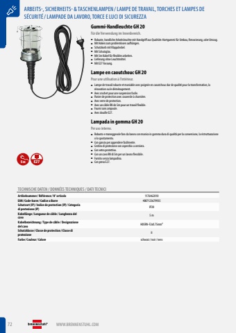 Gummi-Handleuchte GH 20F%u00fcr die Verwendung im Innenbereich.%u25a0 Robuste, handliche Arbeitsleuchte mit Handgriff aus Qualit%u00e4ts-Hartgummi f%u00fcr Umbau, Renovierung, oder Umzug.%u25a0 Mit Haken zum problemlosen aufh%u00e4ngen.%u25a0 Schutzkorb mit Klappdeckel.%u25a0 Mit Schutzglas.%u25a0 Mit 5m Kabel f%u00fcr flexibles arbeiten. %u25a0 Lieferung ohne Leuchtmittel.%u25a0 Mit E27 Fassung.Lampe en caoutchouc GH 20Pour une utilisation %u00e0 l%u2019int%u00e9rieur.%u25a0 Lampe de travail robuste et maniable avec poign%u00e9e en caoutchouc dur de qualit%u00e9 pour la transformation, la r%u00e9novation ou le d%u00e9m%u00e9nagement.%u25a0 Avec crochet pour une suspension facile.%u25a0 Panier de protection avec couvercle %u00e0 charni%u00e8re.%u25a0 Avec verre de protection.%u25a0 Avec un c%u00e2ble RN de 5m pour un travail flexible. %u25a0 Fourni sans ampoule.%u25a0 Avec douille E27.Lampada in gomma GH 20Per uso interno.%u25a0 Robusto e maneggevole faro da lavoro con manico in gomma dura di qualit%u00e0 per la conversione, la ristrutturazione o lo spostamento.%u25a0 Con gancio per appendere facilmente.%u25a0 Cestino di protezione con coperchio a cerniera.%u25a0 Con vetro protettivo.%u25a0 Con un cavo RN di 5m per un lavoro flessibile. %u25a0 Fornito senza lampadina.5m %u25a0 Con presa E27.TECHNISCHE DATEN / DONN%u00c9ES TECHNIQUES / DATI TECNICIArtikelnummer/ R%u00e9f%u00e9rence / N%u00b0 articolo 1176462010EAN/ Code-barre / Codice a Barre 4007123679935Schutzart (IP)/ Indice de protection (IP)/ Categoria di protezione (IP) IP20Kabell%u00e4nge / Longueur de c%u00e2ble / Lunghezza del cavo5 mKabelbezeichnung / Type de c%u00e2ble / Designazione del cavo H05RN-F2x0.75mm%u00b2Schutzklasse / Classe de protection / Classe di protezione IIFarbe / Couleur/ Colore schwarz/ noir/ neroE2772 WWW.BRENNENSTUHL.COMARBEITS-, SICHERHEITS- & TASCHENLAMPEN /LAMPE DE TRAVAIL, TORCHES ET LAMPES DE S%u00c9CURIT%u00c9/LAMPADE DA LAVORO, TORCE E LUCI DI SICUREZZA