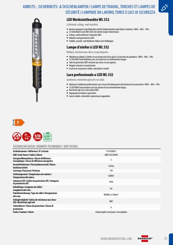 WWW.BRENNENSTUHL.COM 73ARBEITS-, SICHERHEITS- & TASCHENLAMPEN /LAMPE DE TRAVAIL, TORCHES ET LAMPES DE S%u00c9CURIT%u00c9/LAMPADE DA LAVORO, TORCE E LUCI DI SICUREZZALED Werkstattleuchte WL 552 Lichtstark, schlag- und stossfest.%u25a0 Bestens geeignet in der Werkstatt und f%u00fcr Hobby Arbeiten dank Dimm-Funktion: 100% - 40% - 10%.%u25a0 12 lichtstarke Seoul SMD-LEDs mit extrem langer Lebensdauer.%u25a0 Schlag- und bruchfestes Schutzrohr IK07.%u25a0 Robuster und gummierter Griff.%u25a0 Stabiler, auszieh- und drehbarer Haken zum Aufh%u00e4ngen.Lampe d%u2019atelier %u00e0 LED WL 552 Brillant, r%u00e9sistant aux chocs et aux impacts. .%u25a0 Id%u00e9alement adapt%u00e9 %u00e0 l%u2019atelier et aux travaux de loisirs gr%u00e2ce %u00e0 la fonction de gradation: 100% - 40% - 10%.%u25a0 12 LED SMD Seoul brillantes avec une dur%u00e9e de vie extr%u00eamement longue.%u25a0 Tube de protection IK07 r%u00e9sistant aux chocs et aux ruptures.%u25a0 Poign%u00e9e robuste et caoutchout%u00e9e.%u25a0 Crochet de suspension stable, extensible et rotatif.Luce professionale a LED WL 552 Luminoso, resistente agli urti e ai colpi.%u25a0 Ideale per l%u2019ambiente professionale e per i lavori di hobby grazie alla funzione di oscuramento: 100% - 40% - 10%.%u25a0 12 LED SMD Seoul luminosi con una durata di vita estremamente lunga.%u25a0 Resistente agli urti e alla rottura IK07.%u25a0 Impugnatura robusta e gommata.%u25a0 Gancio stabile, estensibile e girevole per appendere.IK07 5m570LUMENTECHNISCHE DATEN / DONN%u00c9ES TECHNIQUES / DATI TECNICIArtikelnummer/ R%u00e9f%u00e9rence / N%u00b0 articolo 1175470012EAN/ Code-barre / Codice a Barre 4007123310449Energieeffizienzklasse / Classe d%u2019efficience %u00e9nerg%u00e9tique / Classe di efficienza energetica FGesamtlichtstrom/ Flux lumineux total/ Flusso luminoso totale 570 lmLeistung / Puissance / Potenza 7 WFarbtemperatur/ Temp%u00e9rature de couleur/ Temperatura del colore 6500 KSchutzart (IP)/ Indice de protection (IP)/ Categoria di protezione (IP) IP20Kabell%u00e4nge / Longueur de c%u00e2ble / Lunghezza del cavo 5mKabelbezeichnung / Type de c%u00e2ble / Designazione del cavoH05RN 2 x1.0mm%u00b2Schlagfestigkeit/ Indice de r%u00e9sistance aux chocs (IK)/ Resistenza agli urti IK07Schutzklasse / Classe de protection / Classe di protezione IIFarbe / Couleur/ Colore schwarz/gelb/ noir/jaune/ nero/gialloa
