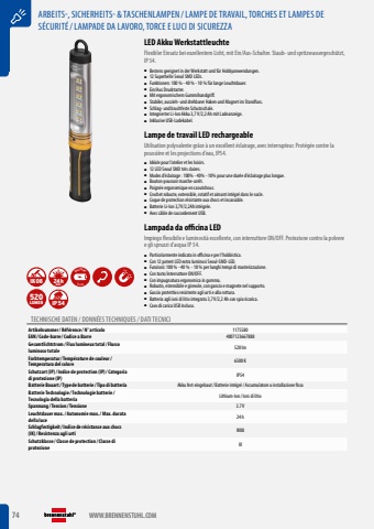 74 WWW.BRENNENSTUHL.COMARBEITS-, SICHERHEITS- & TASCHENLAMPEN /LAMPE DE TRAVAIL, TORCHES ET LAMPES DE S%u00c9CURIT%u00c9/LAMPADE DA LAVORO, TORCE E LUCI DI SICUREZZALED Akku WerkstattleuchteFlexibler Einsatz bei exzellentem Licht, mit Ein/Aus-Schalter. Staub- und spritzwassergesch%u00fctzt, IP 54.%u25a0 Bestens geeignet in der Werkstatt und f%u00fcr Hobbyanwendungen.%u25a0 12 Superhelle Seoul SMD LEDs.%u25a0 Funktionen: 100 % - 40 % - 10 % f%u00fcr lange Leuchtdauer.%u25a0 Ein/Aus Drucktaster.%u25a0 Mit ergonomischem Gummihandgriff.%u25a0 Stabiler, auszieh- und drehbarer Haken und Magnet im Standfuss.%u25a0 Schlag- und bruchfeste Schutzschale.%u25a0 Integrierter Li-Ion Akku 3,7 V/2,2 Ah mit Ladeanzeige.%u25a0 Inklusive USB-Ladekabel.Lampe de travail LED rechargeableUtilisation polyvalente gr%u00e2ce %u00e0 un excellent %u00e9clairage, avec interrupteur. Prot%u00e9g%u00e9e contre la poussi%u00e8re et les projections d%u2019eau, IP54.%u25a0 Id%u00e9ale pour l%u2019atelier et les loisirs.%u25a0 12 LED Seoul SMD tr%u00e8s claires.%u25a0 Modes d%u2019%u00e9clairage : 100% - 40% - 10% pour une dur%u00e9e d%u2019%u00e9clairage plus longue.%u25a0 Bouton-poussoir marche-arr%u00eat.%u25a0 Poign%u00e9e ergonomique en caoutchouc.%u25a0 Crochet robuste, extensible, rotatif et aimant int%u00e9gr%u00e9 dans le socle.%u25a0 Coque de protection r%u00e9sistante aux chocs et incassable.%u25a0 Batterie Li-Ion 3,7V/2,2Ah int%u00e9gr%u00e9e.%u25a0 Avec c%u00e2ble de raccordement USB.Lampada da officina LEDImpiego flessibile e luminosit%u00e0 eccellente, con interruttore ON/OFF. Protezione contro la polvere e gli spruzzi d%u2019acqua IP 54.%u25a0 Particolarmente indicata in officina e per l%u2019hobbistica.%u25a0 Con 12 potent LED extra luminosi Seoul-SMD-LED.%u25a0 Funzioni: 100 % - 40 %%u00a0 - 10 % per lunghi tempi di masterizzazione.%u25a0 Con tasto/interruttore ON/OFF.%u25a0 Con impugnatura ergonomica in gomma.%u25a0 Robusto, estensibile e girevole, con gancio e magnete nel supporto.%u25a0 Guscio protettivo resistente agli urti e alla rottura.%u25a0 Batteria agli ioni di litio integrata 3,7 V/2,2 Ah con spia ricarica.%u25a0 Cavo di carica USB incluso.TECHNISCHE DATEN / DONN%u00c9ES TECHNIQUES / DATI TECNICIArtikelnummer/ R%u00e9f%u00e9rence / N%u00b0 articolo 1175580EAN/ Code-barre / Codice a Barre 4007123667888Gesamtlichtstrom/ Flux lumineux total/ Flusso luminoso totale 520 lmFarbtemperatur/ Temp%u00e9rature de couleur/ Temperatura del colore 6500 KSchutzart (IP)/ Indice de protection (IP)/ Categoria di protezione (IP) IP54Batterie Bauart/ Type de batterie / Tipo di batteria Akku fest eingebaut/ Batterie int%u00e9gr%u00e9/ Accumulatore a installazione fissaBatterie Technologie / Technologie batterie / Tecnologia della batteria Lithium-Ion / Ioni di litioSpannung / Tension / Tensione 3.7 VLeuchtdauer max./ Autonomie max./ Max. durata della luce 24 hSchlagfestigkeit/ Indice de r%u00e9sistance aux chocs (IK)/ Resistenza agli urti IK08Schutzklasse / Classe de protection / Classe di protezione IIIIP54Li-IonINCLUSIVEMAX. IK08 24h520LUMEN