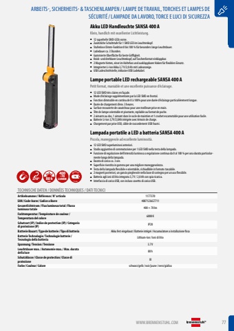 WWW.BRENNENSTUHL.COM 77ARBEITS-, SICHERHEITS- & TASCHENLAMPEN /LAMPE DE TRAVAIL, TORCHES ET LAMPES DE S%u00c9CURIT%u00c9/LAMPADE DA LAVORO, TORCE E LUCI DI SICUREZZAAkku LED Handleuchte SANSA 400 AKlein, handlich mit exzellenter Lichtleistung.%u25a0 12 superhelle SMD-LEDs vorne.%u25a0 Zus%u00e4tzliche Schaltstufe f%u00fcr 1 SMD LED im Leuchtenkopf.%u25a0 Stufenlose Dimm-Funktion 0 bis 100 % f%u00fcr besonders lange Leuchtdauer.%u25a0 Ladedauer ca. 3 Stunden.%u25a0 Gummierte Oberfl%u00e4che f%u00fcr beste Griffigkeit.%u25a0 Knick- und drehbarer Leuchtenkopf, auf Taschenformat einklappbar.%u25a0 2 Magnete hinten, einer im Haltefuss und ausklappbarer Haken f%u00fcr flexiblen Einsatz.%u25a0 Integrierter Li-Ion Akku 3,7 V/2,0 Ah mit Ladeanzeige.%u25a0 USB Ladeschnittstelle, inklusive USB Ladekabel.Lampe portable LED rechargeable SANSA 400 APetit format, maniable et une excellente puissance d%u2019%u00e9clairage.%u25a0 12 LED SMD tr%u00e8s claires en fa%u00e7ade.%u25a0 Mode d%u2019%u00e9clairage suppl%u00e9mentaire par la LED SMD en frontal.%u25a0 Fonction dimmable en continu de 0 %u00e0 100% pour une dur%u00e9e d%u2019%u00e9clairage particuli%u00e8rement longue.%u25a0 Dur%u00e9e de chargement d%u2019env. 3 heures.%u25a0 Surface recouverte de caoutchouc pour une meilleure prise en main.%u25a0 T%u00eate de lampe orientable et pivotante, repliable au format de poche.%u25a0 2 aimants au dos, 1 aimant dans le socle de maintien et 1 crochet escamotable pour une utilisation facile.%u25a0 Batterie Li-Ion 3,7V/2,0Ah int%u00e9gr%u00e9e avec t%u00e9moin de charge.%u25a0 Chargement par prise USB, c%u00e2ble de raccordement USB fourni.Lampada portatile a LED a batteria SANSA 400 APiccola, maneggevole ad eccellente luminosit%u00e0.%u25a0 12 LED SMD superluminosi anteriori.%u25a0 Stadio aggiuntivo di commutazione per 1 LED SMD nella testa della lampada.%u25a0 Funzione di regolazione dell%u2019intensit%u00e0 luminosa a regolazione continua da 0 al 100 % per una durata particolarmente lunga della lampada.%u25a0 Durata di carica ca. 3 ore.%u25a0 Superficie rivestita in gomma per una migliore maneggevolezza.%u25a0 Testa della lampada flessibile e orientabile, richiudibile in formato tascabile.%u25a0 2 magneti posteriori, un gancio pieghevole nella base di sostegno per un uso flessibile.%u25a0 Batteria agli ioni di litio integrata 3,7 V / 2,0 Ah con spia ricarica.%u25a0 Interfaccia di carica USB, con incluso cavetto di carica USB. 270%u00b0 MAX.80h +70LUMEN400Li-IonINCLUSIVETECHNISCHE DATEN / DONN%u00c9ES TECHNIQUES / DATI TECNICIArtikelnummer/ R%u00e9f%u00e9rence / N%u00b0 articolo 1177370EAN/ Code-barre / Codice a Barre 4007123657711Gesamtlichtstrom/ Flux lumineux total/ Flusso luminoso totale 400 + 70 lmFarbtemperatur/ Temp%u00e9rature de couleur/ Temperatura del colore 6000 KSchutzart (IP)/ Indice de protection (IP)/ Categoria di protezione (IP) IP20Batterie Bauart/ Type de batterie / Tipo di batteria Akku fest eingebaut/ Batterie int%u00e9gr%u00e9/ Accumulatore a installazione fissaBatterie Technologie / Technologie batterie / Tecnologia della batteria Lithium-Ion / Ioni di litioSpannung / Tension / Tensione 3.7 VLeuchtdauer max./ Autonomie max./ Max. durata della luce 80 hSchutzklasse / Classe de protection / Classe di protezione IIIFarbe / Couleur/ Colore schwarz/gelb/ noir/jaune/ nero/gialloa
