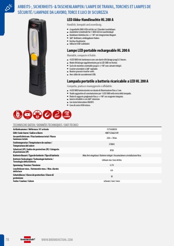 78 WWW.BRENNENSTUHL.COMARBEITS-, SICHERHEITS- & TASCHENLAMPEN /LAMPE DE TRAVAIL, TORCHES ET LAMPES DE S%u00c9CURIT%u00c9/LAMPADE DA LAVORO, TORCE E LUCI DI SICUREZZALED Akku-Handleuchte HL 200 AHandlich, kompakt und zuverl%u00e4ssig.%u25a0 4 superhelle SMD-LEDs mit bis zu 3 Stunden Leuchtdauer.%u25a0 Zus%u00e4tzliche Schaltstufe f%u00fcr 1 SMD LED im Leuchtenkopf.%u25a0 Knickbarer Haltefuss bis +/- 90%u00b0 mit integriertem Magnet.%u25a0 360%u00b0 drehbarer, einklappbarer Haken.%u25a0 Ein/Aus Drucktaster.%u25a0 Inklusive USB-Ladekabel.Lampe LED portable rechargeable HL 200 AManiable, compacte et fiable.%u25a0 4 LED SMD tr%u00e8s lumineuses avec une dur%u00e9e d%u2019%u00e9clairage jusqu%u2019%u00e0 3 heures.%u25a0 Mode d%u2019%u00e9clairage suppl%u00e9mentaire par la LED SMD en frontal.%u25a0 Socle de maintien orientable jusqu%u2019%u00e0 +/-90%u00b0 avec aimant int%u00e9gr%u00e9.%u25a0 Crochet orientable %u00e0 360%u00b0 repliable.%u25a0 Bouton-poussoir marche-arr%u00eat.%u25a0 Avec c%u00e2ble de raccordement USB.Lampada portatile a batteria ricaricabile a LED HL 200 ACompatta, pratica e maneggevole e affidabile.%u25a0 4 LED SMD luminosissimi con durata di illuminazione fino a 3 ore.%u25a0 Stadio aggiuntivo di commutazione per 1 LED SMD nella testa della lampada.%u25a0 Piede di supporto pieghevole fino a +/-90%u00b0 con magnete integrato.%u25a0 Gancio retraibile e con 360%u00b0 rotazione.%u25a0 Con tasto/interruttore ON/OFF.%u25a0 Cavo di carica USB incluso.USB RECHARGEABLELi-IonINCLUSIVE MAX.6h 360%u00b0 +70LUMEN250TECHNISCHE DATEN / DONN%u00c9ES TECHNIQUES / DATI TECNICIArtikelnummer/ R%u00e9f%u00e9rence / N%u00b0 articolo 1175430010EAN/ Code-barre / Codice a Barre 4007123663149Gesamtlichtstrom/ Flux lumineux total/ Flusso luminoso totale 250 + 70 lmFarbtemperatur/ Temp%u00e9rature de couleur/ Temperatura del colore 5700 KSchutzart (IP)/ Indice de protection (IP)/ Categoria di protezione (IP) IP20Batterie Bauart/ Type de batterie / Tipo di batteria Akku fest eingebaut/ Batterie int%u00e9gr%u00e9/ Accumulatore a installazione fissaBatterie Technologie / Technologie batterie / Tecnologia della batteria Lithium-Ion / Ioni di litioSpannung / Tension / Tensione 3.7 VLeuchtdauer max./ Autonomie max./ Max. durata della luce 6 hSchutzklasse / Classe de protection / Classe di protezione IIIFarbe / Couleur/ Colore schwarz/ noir/ nero