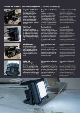 Features und -Details / Caract%u00e9ristiques et d%u00e9tails / Caratteristiche e dettagliKompatibel mit 18 V Akkus Kompatibel mit 18 V Akkus (verschiedene Ah Klassen) der Powertool-Hersteller Bosch Professional, Makita, Metabo/CAS, Milwaukee, Dewalt, Flex, Festool, Einhell, W%u00fcrth, Hikoki. Die innovative SchnittstellenTechnologie erm%u00f6glicht maximale Flexibilit%u00e4t.Compatible avec les batteries 18 VCompatible avec les batteries 18 V (diff%u00e9rentes classes Ah) des fabricants de powertools Bosch Professional, Makita, Metabo/CAS, Milwaukee, Dewalt, Flex, Festool, Einhell, W%u00fcrth, Hikoki. La technologie d%u2018interface innovante permet une flexibilit%u00e9 maximale.Compatibile con batterie da 18 VCompatibile con le batterie ricaricabili da 18 V (varie classi di Ah) dei produttori di elettroutensili Bosch Professional, Makita, Metabo/CAS, Milwaukee, Dewalt, Flex, Festool, Einhell, W%u00fcrth, Hikoki. L%u2018innovativa tecnologia di interfaccia consente la massima flessibilit%u00e0.Hybrid-Technik Mit der Hybrid Technik ist die Nutzung des Arbeits-strahlers %u00fcber den eingesetzten Akku, aber auch mit zus%u00e4tzlichem Anschlusskabel %u00fcber Netzbetrieb m%u00f6glich. Absolut sicher: Automatisches Umschalten bei Stromausfall im Netzbetrieb auf Akku.Technique hybride Gr%u00e2ce %u00e0 la technique hybride, l%u2018utilisation du projecteur de travail est possible via la batterie utilis%u00e9e, mais aussi sur secteur avec un c%u00e2ble de raccordement suppl%u00e9mentaire. S%u00e9curit%u00e9 absolue : commutation automatique en cas de panne de courant en mode secteur sur batterie.Tecnologia ibrida Grazie alla tecnologia ibrida, il proiettore da lavoro pu%u00f2 essere utilizzato tramite la batteria ricaricabile inserita, ma anche con un cavo di collegamento aggiuntivo per il funzionamento a rete. Assolutamente sicuro: commutazione automatica in caso di interruzione di corrente nel funzionamento a rete.Akku-Schutzhaube Die Steckverbindung ist durch eine geschlossene und dichte Akku-Schutzhaube vor Schmutz oder Feuchtigkeit gesch%u00fctzt. Bei entfernter Schutzhaube k%u00f6nnen auch gr%u00f6ssere Akkus verwendet werden.Capot de protection de la batterie Le connecteur est prot%u00e9g%u00e9 de la salet%u00e9 et de l%u2018humidit%u00e9 par un capot de protection ferm%u00e9 et %u00e9tanche. Lorsque le capot de protection est retir%u00e9, il est possible d%u2018utiliser des batteries plus grandes.Coperchio protettivo della batteria Il collegamento a spina %u00e8 protetto dallo sporco o dall%u2018umidit%u00e0 grazie a un coperchio di protezione della batteria chiuso e ben saldo. Con il coperchio di protezione rimosso, %u00e8 possibile utilizzare anche batterie pi%u00f9 grandi.Schalter und Zustandsanzeigen Mit Schalter zum Einstellen von 100%, 75%, 50% oder 25% Licht f%u00fcr eine l%u00e4ngere Leuchtdauer und einer optischen Anzeige der aktuell eingestellten Lichtstufe, sowie einer Zustandsanzeige f%u00fcr die vorhandene Restenergie des eingesetzten Akkus. Interrupteurs et indicateurs d%u2018%u00e9tat Avec interrupteur permettant de r%u00e9gler la lumi%u00e8re %u00e0 100%, 75%, 50% ou 25% pour une dur%u00e9e d%u2018%u00e9clairage plus longue et un affichage optique du niveau d%u2018%u00e9clairage actuellement r%u00e9gl%u00e9, ainsi qu%u2018un affichage de l%u2018%u00e9tat de l%u2018%u00e9nergie restante de l%u2018accumulateur utilis%u00e9. Interruttori e indicatori di stato Con interruttore per l%u2018impostazione del 100%, 75%, 50% o 25% di luce per un periodo di illuminazione pi%u00f9 lungo e un display visivo del livello di luce attualmente impostato, nonch%u00e9 un display di stato per l%u2018energia residua disponibile della batteria utilizzata..