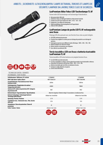 WWW.BRENNENSTUHL.COM 83ARBEITS-, SICHERHEITS- & TASCHENLAMPEN /LAMPE DE TRAVAIL, TORCHES ET LAMPES DE S%u00c9CURIT%u00c9/LAMPADE DA LAVORO, TORCE E LUCI DI SICUREZZALuxPremium Akku-Fokus-LED-Taschenlampe TL AFExtrem helle LED Taschenlampe mit hochwertiger Fokusfunktion.%u25a0 Mit extrem heller CREE-LED.%u25a0 Stufenloser Fokus von fl%u00e4chigem Nahlicht zu fokussiertem Fernlicht.%u25a0 Schalter mit Soft-Touch Funktion f%u00fcr 100 % - 40 % - 10 % - SOS.%u25a0 Integrierter Li-Ion-Akku mit Ladeanzeige.%u25a0 Widerstandsf%u00e4higes Aluminiumgeh%u00e4use mit Trageschlaufe.%u25a0 Inklusive USB-Ladekabel.LuxPremium Lampe de poche LED TL AF rechargeable avec focus%u00c9clairage LED ultra puissant avec une fonction focus mise au point int%u00e9gr%u00e9e.%u25a0 LED CREE extr%u00eamement puissante.%u25a0 Fonction focus r%u00e9glable en continu pour un %u00e9clairage de proximit%u00e9 ou un %u00e9clairage de pr%u00e9cision.%u25a0 Interrupteur %u00e0 pression avec diff%u00e9rents modes d%u2019%u00e9clairage : 100% - 40% - 10% - SOS.%u25a0 Batterie int%u00e9gr%u00e9e avec t%u00e9moin de charge.%u25a0 Bo%u00eetier r%u00e9sistant en aluminium avec dragonne.%u25a0 Avec c%u00e2ble de raccordement USB.Torcia tascabile a LED con focus e batteria ricaricabile LuxPremium TL AFTorcia tascabile a LED extra luminosa con pregiata funzione focus.%u25a0 Con LED CREE da ad alta luminosit%u00e0.%u25a0 Con focus regolabile in continuo, da luce piatta di prossimit%u00e0 a luce focalizzabile a distanza.%u25a0 Interruttore con funzione soft touch per 100 % - 40 % - 10 % - SOS.%u25a0 Batteria ricaricabile agli ioni di litio con indicatore di carica.%u25a0 Involucro in solido alluminio con gancio.%u25a0 Cavo di carica USB incluso.CREELED USB RECHARGEABLELi-IonINCLUSIVE FOCUS IP67TECHNISCHE DATEN / DONN%u00c9ES TECHNIQUES / DATI TECNICIArtikelnummer/ R%u00e9f%u00e9rence / N%u00b0 articolo 1178600401 1178600800EAN/ Code-barre / Codice a Barre 4007123663224 4007123663408Gesamtlichtstrom/ Flux lumineux total/ Flusso luminoso totale 630 lm 1250 lmFarbtemperatur/ Temp%u00e9rature de couleur/ Temperatura del colore 6500 K 7000 KSchutzart (IP)/ Indice de protection (IP)/ Categoria di protezione (IP) IP67 IP67Batterie Bauart/ Type de batterie / Tipo di batteria Akku fest eingebaut/ Batterie int%u00e9gr%u00e9/ Accumulatore a installazione fissaBatterie Technologie / Technologie batterie / Tecnologia della batteria Lithium-Ion / Ioni di litio Lithium-Ion / Ioni di litioSpannung / Tension / Tensione 3.7 V 3.7 VLeuchtdauer max./ Autonomie max./ Max. durata della luce 22 h 15 hSchutzklasse / Classe de protection / Classe di protezione III IIIFarbe / Couleur/ Colore schwarz/ noir/ nero schwarz/ noir/ nero175m630LUMEN 220m1250LUMEN