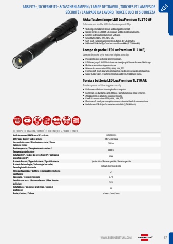 WWW.BRENNENSTUHL.COM 87ARBEITS-, SICHERHEITS- & TASCHENLAMPEN /LAMPE DE TRAVAIL, TORCHES ET LAMPES DE S%u00c9CURIT%u00c9/LAMPADE DA LAVORO, TORCE E LUCI DI SICUREZZAAkku Taschenlampe LED LuxPremium TL 210 AFSchlanke und leichte Stift-Taschenlampe mit Clip.%u25a0 Vielseitig einsetzbar im kleinen und kompakten Format.%u25a0 Osram-LED bis zu 50.000h Lebensdauer und bis zu 50m Leuchweite.%u25a0 Leichtes und robustes Aluminium-Geh%u00e4use.%u25a0 Schaltstufen 100%, 40%, 10%, SOS.%u25a0 Soft-Touch-Funktion zum schnellen Schalten der Schaltstufen.%u25a0 Inklusive USB-Kabel Typ C und austauschbaren Akku (3.7V/600mAh).Lampe de poche LED LuxPremium TL 210 F,Lampe de poche stylo mince et l%u00e9g%u00e8re avec clip.%u25a0 Polyvalente dans un format petit et compact.%u25a0 LED Osram jusqu%u2019%u00e0 50.000h de dur%u00e9e de vie et jusqu%u2019%u00e0 50m de distance d%u2019%u00e9clairage.%u25a0 Bo%u00eetier en aluminium l%u00e9ger et robuste.%u25a0 Niveaux de commutation 100%, 40%, 10%, SOS.%u25a0 Fonction Soft-Touch pour une commutation rapide des niveaux de commutation.%u25a0 C%u00e2ble USB de type C et batterie interchangeable (3.7V/600mAh) inclus.Torcia a batteria LED LuxPremium TL 210 AF,Torcia a penna sottile e leggera con clip.%u25a0 Utilizzo versatile in un formato piccolo e compatto.%u25a0 LED Osram con durata fino a 50.000 ore e portata luminosa fino a 50 metri.%u25a0 Alloggiamento in alluminio leggero e robusto.%u25a0 Livelli di commutazione 100%, 40%, 10%, SOS.%u25a0 Funzione soft touch per una rapida commutazione dei livelli di commutazione.%u25a0 Include cavo USB di tipo C e batteria sostituibile (3,7V/600mAh).Li-IonINCLUSIVE MAX.13h 55m FOCUS IP44200LUMENTECHNISCHE DATEN / DONN%u00c9ES TECHNIQUES / DATI TECNICIArtikelnummer/ R%u00e9f%u00e9rence / N%u00b0 articolo 1173750003EAN/ Code-barre / Codice a Barre 4007123684656Gesamtlichtstrom/ Flux lumineux total/ Flusso luminoso totale 200 lmFarbtemperatur/ Temp%u00e9rature de couleur/ Temperatura del colore 6800 KSchutzart (IP)/ Indice de protection (IP)/ Categoria di protezione (IP) IP44Batterie Bauart/ Type de batterie / Tipo di batteria Spezial Akku/ Batterie sp%u00e9ciale/ Batteria specialeBatterie Technologie / Technologie batterie / Tecnologia della batteria Lithium-Ion / Ioni di litioAkku austauschbar / Batterie rempla%u00e7able / Batteria sostituibile %uf001Spannung / Tension / Tensione 3.7 VLeuchtdauer max./ Autonomie max./ Max. durata della luce 13 hSchutzklasse / Classe de protection / Classe di protezione IIIFarbe / Couleur/ Colore schwarz/ noir/ nero