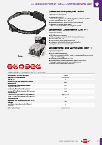 WWW.BRENNENSTUHL.COM 91LED-STIRNLAMPEN /LAMPES FRONTALES/LAMPADA FRONTALE A LEDLuxPremium LED-Kopflampe KL 100 IP 44Superleicht und leistungsstark.%u25a0 Mit extrem heller CREE-LED.%u25a0 Ideal um beim Joggen, Wandern oder bei Montagearbeiten beide H%u00e4nde freizuhalten.%u25a0 Schalter mit Funktionen f%u00fcr 100 % - 20 % - SOS.%u25a0 Neigungswinkel einstellbar, leichtes und robustes Kunststoffgeh%u00e4use.%u25a0 Batteriepack am Hinterkopf f%u00fcr gute Balance.%u25a0 10 St%u00fcck werden im verkaufsf%u00f6rdernden Display-Karton geliefert.Lampe frontale LED LuxPremium KL 100 IP44Alimentation par piles.%u25a0 LED CREE extr%u00eamement lumineuse.%u25a0 Id%u00e9al pour le jogging, les randonn%u00e9es, le v%u00e9lo et les travaux de bricolage.%u25a0 Fonctions 100% - 20% - SOS.%u25a0 Angle d%u2019inclinaison r%u00e9glable, bo%u00eetier l%u00e9ger et r%u00e9sistant.%u25a0 Compartiment %u00e0 piles situ%u00e9 %u00e0 l%u2019arri%u00e8re pour un meilleur %u00e9quilibre.%u25a0 Livr%u00e9e par 10 p. dans un pr%u00e9sentoir auto-vendeur.Lampada frontale a LED LuxPremium KL 100 IP 44Super leggera e potente.%u25a0 Con LED CREE da ad alta luminosit%u00e0.%u25a0 Ideale per avere entrambe le mani libere quando si pratica jogging, si fanno escursioni o si eseguono lavori di montaggio.%u25a0 Interruttore con funzioni per 100 % - 20 % - SOS.%u25a0 Angolo d%u2019inclinazione regolabile, telaio leggero e robusto in materia plastica.%u25a0 Battery pack nella parte posteriore per un corretto bilanciamento.%u25a0 Imballo da 10 pezzi in espositore di cartone a colori.60m MAX.35h BATTERYINCLUSIVECREELED 100LUMEN IP44TECHNISCHE DATEN / DONN%u00c9ES TECHNIQUES / DATI TECNICIArtikelnummer/ R%u00e9f%u00e9rence / N%u00b0 articolo 1178760EAN/ Code-barre / Codice a Barre 4007123636723VPE/ UC/ U.I. 10Gesamtlichtstrom/ Flux lumineux total/ Flusso luminoso totale 100 lmFarbtemperatur/ Temp%u00e9rature de couleur/ Temperatura del colore 6500 KLeuchtweite / Port%u00e9e / Intensit%u00e0 luminosa 60 mSchutzart (IP)/ Indice de protection (IP)/ Categoria di protezione (IP) IP44Batterie Bauart/ Type de batterie / Tipo di batteria Mignon AA LR6Anzahl der Batterien / Nombre de piles/ batteries/ Numero di batterie 2Leuchtdauer max./ Autonomie max./ Max. durata della luce 35 hSchutzklasse / Classe de protection / Classe di protezione IIIFarbe / Couleur/ Colore schwarz/ noir/ neroDisplay
