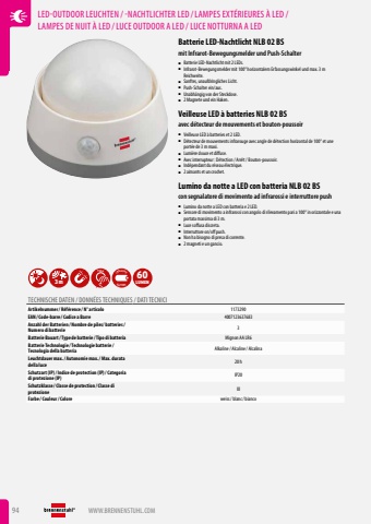 94 WWW.BRENNENSTUHL.COMLED-OUTDOOR LEUCHTEN / -NACHTLICHTER LED /LAMPES EXT%u00c9RIEURES %u00c0 LED / LAMPES DE NUIT %u00c0 LED /LUCE OUTDOOR A LED / LUCE NOTTURNA A LEDBatterie LED-Nachtlicht NLB 02 BSmit Infrarot-Bewegungsmelder und Push-Schalter%u25a0 Batterie LED-Nachtlicht mit 2 LEDs.%u25a0 Infrarot-Bewegungsmelder mit 100%u00b0 horizontalem Erfassungswinkel und max. 3 m Reichweite.%u25a0 Sanftes, unaufdringliches Licht.%u25a0 Push-Schalter ein/aus.%u25a0 Unabh%u00e4ngig von der Steckdose.%u25a0 2 Magnete und ein Haken.Veilleuse LED %u00e0 batteries NLB 02 BSavec d%u00e9tecteur de mouvements et bouton-poussoir%u25a0 Veilleuse LED %u00e0 batteries et 2 LED.%u25a0 D%u00e9tecteur de mouvements infrarouge avec angle de d%u00e9tection horizontal de 100%u00b0 et une port%u00e9e de 3 m maxi.%u25a0 Lumi%u00e8re douce et diffuse.%u25a0 Avec interrupteur%u00a0: D%u00e9tection / Arr%u00eat / Bouton-poussoir.%u25a0 Ind%u00e9pendant du r%u00e9seau %u00e9lectrique.%u25a0 2 aimants et un crochet.Lumino da notte a LED con batteria NLB 02 BScon segnalatore di movimento ad infrarossi e interruttore push%u25a0 Lumino da notte a LED con batteria e 2 LED.%u25a0 Sensore di movimento a infrarossi con angolo di rilevamento pari a 100%u00b0 in orizzontale e una portata massima di 3 m.%u25a0 Luce soffusa discreta.%u25a0 Interruttore on/off push.%u25a0 Non ha bisogno di presa di corrente.%u25a0 2 magneti e un gancio.3mPUSHBATTERYINCLUSIVE60LUMENTECHNISCHE DATEN / DONN%u00c9ES TECHNIQUES / DATI TECNICIArtikelnummer/ R%u00e9f%u00e9rence / N%u00b0 articolo 1173290EAN/ Code-barre / Codice a Barre 4007123637683Anzahl der Batterien / Nombre de piles/ batteries/ Numero di batterie 3Batterie Bauart/ Type de batterie / Tipo di batteria Mignon AA LR6Batterie Technologie / Technologie batterie / Tecnologia della batteria Alkaline/ Alcaline/ AlcalinaLeuchtdauer max./ Autonomie max./ Max. durata della luce 20 hSchutzart (IP)/ Indice de protection (IP)/ Categoria di protezione (IP) IP20Schutzklasse / Classe de protection / Classe di protezione IIIFarbe / Couleur/ Colore weiss/ blanc/ bianco