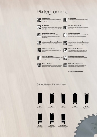 PiktogrammeAbsaugungAbsaugstutzen f%u00fcr Staub-/Sp%u00e4ne-Absaugung im Standard-Lieferumfang.Pendelhub4 Pendelhub-Einstellungen des S%u00e4geblattes m%u00f6glich.FLIPPKEILMit dieser Handkreiss%u00e4ge kann exakt eingetaucht werden, ohne dass der Spaltkeil demontiert werden muss.Rechts-/LinkslaufUmschaltbar auf wahlweise Rechts- oder Linkslauf.F%u00fchrungs-SystemZu dieser Maschine werden F%u00fchrungsschienen in verschiedenen L%u00e4ngen angeboten.RutschkupplungS%u00e4geblatt-Rutschkupplung sorgt f%u00fcr Sicherheit bei extremen Belastungen.Hohe AbtragsleistungHohe Abtragsleistung dank starker Motorleistung und neuester Technik.Schneller WerkzeugwechselWerkzeug kann mit oder ohne Montageschl%u00fcssel sekundenschnell gewechselt werden.H%u00f6henverstellungSchnitth%u00f6he/-tiefe l%u00e4sst sich exakt einstellen.Sicherheits-BremseWerkzeug wird nach Ausschalten der Maschine automatisch abgebremst.KlettverschlussSchneller Wechsel und sicherer Halt des Schleifpapieres durch Kletthaftung.Einstellbare DrehzahlHub-/Drehzahl kann je nach Material gew%u00e4hlt werden.MAX + KofferMaschine wird serienm%u00e4%u00dfig in robustem Kunststoff- oder Metallkoffer geliefert.VollwellenelektronikSanftanlauf, konstante Drehzahl bei Lastbetrieb und %u00dcberlastschutz.PG = ProduktgruppeS%u00e4gebl%u00e4tter - ZahnformenFZFlachzahnFZ/TRFlachzahn /TrapezzahnWZ/FAWechselzahnmit FaseFZFA/FZFAFlachzahn mit Fase wechselseitigWZWechselzahnWZ/FZWechselzahn /FlachzahnHZHohlzahnTRTrapezzahn