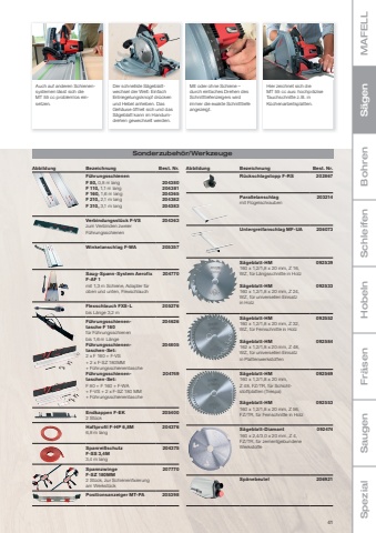 25MAFELLS%u00e4genSchleifenHobelnFr%u00e4senSaugenSpezialBohrenSonderzubeh%u00f6r/WerkzeugeAbbildungBezeichnungBest. Nr.Flexi-Schiene FX 1401,4 m mit Spanrei%u00dfschutz204372Spannzwinge F-SZ 180MM2 St%u00fcck, zur Schienenfixierung am Werkst%u00fcck207770S%u00e4geblatt-HM120 x 1,2 / 1,8 x 20 mm,Z 12, WZ, f%u00fcr L%u00e4ngsschnitte in Holz092560S%u00e4geblatt-HM120 x 1,2 / 1,8 x 20 mm, Z 24, WZ, f%u00fcr universellen Einsatz in Holz092558S%u00e4geblatt-HM120 x 1,2 / 1,8 x 20 mm, Z 40, FZ / TR, f%u00fcr Feinschnitte in Holz092559S%u00e4geblatt-HM120 x 1,2 / 1,8 x 20 mm,Z 40, TR, f%u00fcr Laminat092578F%u00fchrungseinrichtung Smax. Schnittl%u00e4nge 292 mm208169Ein System, f%u00fcnf S%u00e4gen, eine Box: KSS 300 als Kapps%u00e4ge, Tauchs%u00e4ge, Schattenfugens%u00e4ge, Handkreiss%u00e4ge oder Hand kreis s%u00e4ge mit FlexiSchiene FX 140 f%u00fcr gef%u00fchrte Schnitte.Durch die feste Verbindung der Handkreiss%u00e4ge mit der KSS-Kappschiene ergibt sich eine hochfunktionelle Einhand-KappschienenS%u00e4ge.In Kombination mit der rollbaren Flexi-Schiene FX 140 sind pr%u00e4zise gef%u00fchrte Schnitte bis 1,4 m kein Problem.Perfekter Abschluss: Die Abstandhalter der Handkreiss%u00e4ge sorgen daf%u00fcr, dass exakteDehnfugen-Schnitte ab 13 mmBreite leicht von der Hand gehen.AbbildungBezeichnungBest. Nr.Sp%u00e4nebeutel206787