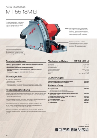 26Akku-Kappschienen-S%u00e4geKSS 40 18M blProduktmerkmale%u2022 Netzunabh%u00e4ngig mit 18 V CAS-LiHD-Technik%u2022 Extrem kompakte und handliche Bauweise%u2022 Schr%u00e4g- und Gehrungsschnitte schnell und einfachEinsatzgebiete%u2022 Kappschnitte mit F%u00fchrungseinrichtung%u2022 L%u00e4ngs- und Querschnitte%u2022 Tauchschnitte, Ausschnitte und Schattenfugen ab 13 mm%u2022 Materialeinsatz z. B.: Plattenwerkstoffe, T%u00fcren, Arbeitsplatten, Parkett und Laminat, VollholzProduktbeschreibungWir haben das Kappschienen-S%u00e4gen erfunden, einfacher und mobiler gemacht und mit der neuen KSS 40 18M bl setzen wir jetzt sogar noch einen Akku drauf. Einen, der h%u00e4lt, was er verspicht: innovative Akku-Technologie f%u00fcr h%u00f6chste Leistung.Die KSS 40 18M bl ist genau der richtige Helfer beim Innenausbau. Ganz gleich f%u00fcr welches Gewerk: Ob B%u00f6den, W%u00e4nde, T%u00fcren, M%u00f6bel, Decken oder Dachlatten, ob Quer- und L%u00e4ngsschnitte, schienengef%u00fchrte Schnitte, Winkel- und Doppelgehrungsschnitte bis 45%u00b0 oder auch Tauchschnitte.Sie ist die konsequente Weiterentwicklung aus 25 j%u00e4hriger Erfahrung in der Kappschienen-S%u00e4ge Technologie und jetzt mit modernster Akku-Technik. Technische Daten KSS 40 18M bl Schnitttiefe mit Schiene bei 0 %u00b0 40 mmSchnitttiefe mit Schiene bei 45 %u00b0 27 mmSchnitttiefe ohne Schiene bei 0 %u00b0 42 mmSchwenkbereich 0 %u2013 45 %u00b0Schnittl%u00e4nge 300 mmWinkelschnitte %u2013 45%u00b0 %u2013 + 60 %u00b0Nennleerlaufdrehzahl 6700 1/minGewicht mit Schiene 3,6 kgAkku 18 V, 99 Wh, LiHDAusf%u00fchrungenAkku-Kappschienen-S%u00e4ge KSS 40 18M bl PURE im T-MAX 91B302Akku-Kappschienen-S%u00e4ge KSS 40 18M bl im T-MAX 91B301Lieferumfang1 Flexi-Schiene FX 140 (nur bei 91B301) 204372 1,4 m mit Spanrei%u00dfschutz2 Spannpratzen (nur bei 91B301) 2037731 S%u00e4geblatt-HM 092558 120 x 1,2 / 1,8 x 20 mm, Z 24, WZ, f%u00fcr universellen Einsatz1 F%u00fchrungseinrichtung S 208169max. Schnittl%u00e4nge 292 mm1 Parallelanschlag 1 Absaugstutzen 2037822 Akku-PowerTank 18M 99 LiHD (nur bei 91B301) 0945031 Akku-PowerStation APS M (nur bei 91B301) 0944921 Sp%u00e4nebeutel 2067871 Sechskantschl%u00fcssel 4mm 093074PG APreisliste Seite 4Der neue, kompakte b%u00fcrstenlose Motor ist extrem langlebig, energieeffizient und wartungsfrei. Durch den Schnellverschluss kann die Maschine mit nur einem Handgriff von der F%u00fchrungseinrichtung getrennt werden. Somit ist sie auch als separate Handkreiss%u00e4ge mit allen Funktionen der MAFELL K-Serie einsetzbar. Mit 40 mm Schnitttiefe auf der Schiene lassen sich nahezu alle S%u00e4geanwendungen einer Baustellenmontage umsetzen und das in purer MAFELL Qualit%u00e4t.Ein fixer Anlegenocken und ein dank gro%u00dfer Skalierung exakt einstellbarer Anschlag %u2013 f%u00fcr pr%u00e4zise Winkelschnitte.