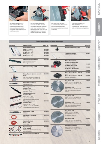27MAFELLS%u00e4genSchleifenHobelnFr%u00e4senSaugenSpezialBohrenSonderzubeh%u00f6r/WerkzeugeAbbildungBezeichnungBest. Nr.Flexi-Schiene FX 1401,4 m mit Spanrei%u00dfschutz204372Spannzwinge F-SZ 180MM2 St%u00fcck, zur Schienenfixierung am Werkst%u00fcck207770S%u00e4geblatt-HM120 x 1,2 / 1,8 x 20 mm,Z 12, WZ, f%u00fcr L%u00e4ngsschnitte in Holz 092560S%u00e4geblatt-HM120 x 1,2 / 1,8 x 20 mm, Z 24, WZ, f%u00fcr universellen Einsatz in Holz092558S%u00e4geblatt-HM120 x 1,2 / 1,8 x 20 mm, Z 40, FZ / TR, f%u00fcr Feinschnitte in Holz092559S%u00e4geblatt-HM120 x 1,2 / 1,8 x 20 mm,Z 40, TR, f%u00fcr Laminat092578Akku-PowerTank 18 M 72 LIHDX LI-ION(118V, 72 WH (LIHDX))18 M 99 LIHD LI-ION(18V, 99 WH (LIHD))18 M 144 LIHD LI-ION(18V, 144 WH (LIHD))094523094503094498Ein System, f%u00fcnf S%u00e4gen, eine Box: KSS 40 18M bl alsKapps%u00e4ge, Tauchs%u00e4ge, Schattenfugen s%u00e4ge, Handkreiss%u00e4ge oder Hand kreis s%u00e4ge mit Flexi-Schiene FX 140 f%u00fcr gef%u00fchrte Schnitte.Durch die feste Verbindung der Handkreiss%u00e4ge mit der KSS-Kappschiene ergibt sich eine hochfunktionelle Einhand-KappschienenS%u00e4ge.In Kombination mit der rollbaren Flexi-Schiene FX 140 sind pr%u00e4zise gef%u00fchrte Schnitte bis 1,4 m kein Problem.Perfekter Abschluss: Die Abstandhalter der Handkreiss%u00e4ge sorgen daf%u00fcr, dass exakteDehnfugen-Schnitte ab 13 mmBreite leicht von der Hand gehen.AbbildungBezeichnungBest. Nr.Akku-PowerStation APS M18 VAkku-PowerStation APS M+Schnell-Ladeger%u00e4t094492094509F%u00fchrungseinrichtung Smax. Schnittl%u00e4nge 292 mm208169Sp%u00e4nebeutel206787Power-Set 22x 18 M 99 LiHD + APS M209599Power-Set 3 2x 18 M 144 LiHD + APS M+209598