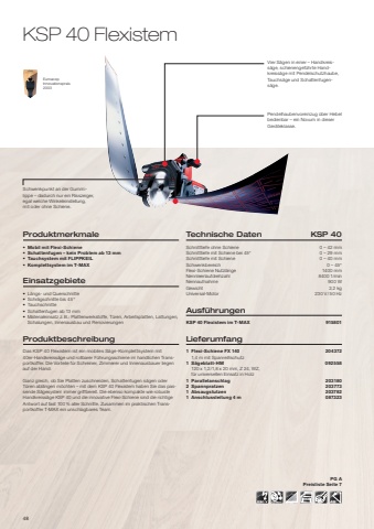 32Kappschienen-S%u00e4geKSS 60 ccProduktmerkmale%u2022 Mit CUprex Hochleistungsmotor%u2022 Tauchsystem mit FLIPPKEILEinsatzgebiete%u2022 Kappschnitte mit F%u00fchrungseinrichtung%u2022 L%u00e4ngs- und Querschnitte%u2022 Tauch- und Ausschnitte%u2022 Materialeinsatz z. B.: Vollholz, Plattenwerkstoffe, D%u00e4mmstoff, T%u00fcren, Arbeitsplatten, Innenausbau und RenovierungenProduktbeschreibungMit ihrem geringen Gewicht und Schnitttiefen von bis zu 60 mm auf der Schiene setzen die neuen, starken Kappschienen-S%u00e4gen von MAFELL deutliche Akzente zum Beispiel beim Innenausbau. Die S%u00e4ge wird nach dem Schnitt automatisch in die Ausgangsposition zur%u00fcckgezogen und bietet bei voller Schnitttiefe eine maximale Schnittl%u00e4ngevon 408 mm.Geballte Power und hohe Drehmomente haben einen Namen: CUprex der Hochleistungsmotor mit leistungsoptimierter Digital-Elektronik und neu entwickelter Steuertechnik. Dabei kann die Drehzahl stufenlos auf unterschiedliche Materialien und Anwendungen eingestellt werden.Es ist kein Abschrauben des Spaltkeils mehr n%u00f6tig %u2013 der FLIPPKEIL bietet Ihnen beim Eintauchen optimalen Benutzerkomfort und Anwendersicherheit.Technische Daten KSS 60 cc Schnitttiefe mit Schiene bei 0%u00b0 0 %u2013 61 mmSchnitttiefe mit Schiene bei 45%u00b0 0 %u2013 47 mmSchnitttiefe ohne Schiene bei 0%u00b0 0 %u2013 67 mmSchnitttiefe ohne Schiene bei 45 0 %u2013 53 mmSchwenkbereich 0 %u2013 45%u00b0Schnittl%u00e4nge 408 mmWinkelschnitte %u2013 60%u00b0 %u2013 + 60%u00b0Nennleerlaufdrehzahl 2700 %u2013 4700 1/minNennaufnahme 1800 WGewicht mit Schiene 6,1 kgUniversal-Motor 230 V / 50 HzAusf%u00fchrungenKappschienen-S%u00e4ge KSS 60 cc 91B101Kappschienen-S%u00e4ge KSS 60 cc im Transportkoffer 91B102Lieferumfang1 S%u00e4geblatt-HM 092489 185 x 1,4/2,4 x 20 mm, Z 32, WZ, f%u00fcr Feinschnitte in Holz1 Parallelanschlag 1 Sechskantschl%u00fcssel 5 mm 0930341 F%u00fchrungseinrichtung M 208170max. Schnittl%u00e4nge 400 mm1 Anschlussleitung 4 mPG APreisliste Seite 5Die gummierte Unterseite h%u00e4lt die Kappschienen-S%u00e4ge sicher auf dem Material und sch%u00fctzt die Werkst%u00fcck-Oberfl%u00e4che vor Besch%u00e4digungen.Mit einem einzigen Knopfdruck l%u00e4sst sich die Maschine von der Kappschiene l%u00f6sen und mit allen Anwendungsm%u00f6glichkeiten der K 65 cc verwenden.Durch das einzigartige Schwenksystem ist im Winkelbereich zwischen 0%u00b0 und 45%u00b0 immer eine Schnitttiefe von 47 mm (inkl. Schiene) erreichbar.