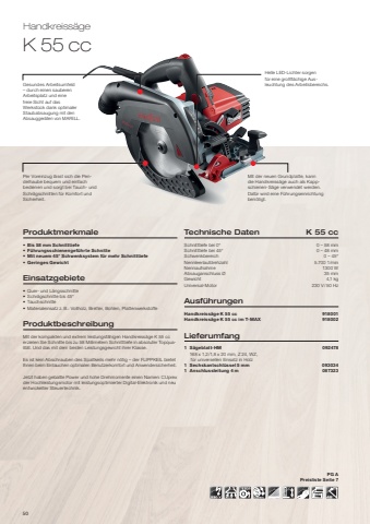 PiktogrammeAbsaugungAbsaugstutzen f%u00fcr Staub-/Sp%u00e4ne-Absaugung im Standard-Lieferumfang.Pendelhub4 Pendelhub-Einstellungen des S%u00e4geblattes m%u00f6glich.FLIPPKEILMit dieser Handkreiss%u00e4ge kann exakt eingetaucht werden, ohne dass der Spaltkeil demontiert werden muss.Rechts-/LinkslaufUmschaltbar auf wahlweise Rechts- oder Linkslauf.F%u00fchrungs-SystemZu dieser Maschine werden F%u00fchrungsschienen in verschiedenen L%u00e4ngen angeboten.RutschkupplungS%u00e4geblatt-Rutschkupplung sorgt f%u00fcr Sicherheit bei extremen Belastungen.Hohe AbtragsleistungHohe Abtragsleistung dank starker Motorleistung und neuester Technik.Schneller WerkzeugwechselWerkzeug kann mit oder ohne Montageschl%u00fcssel sekundenschnell gewechselt werden.H%u00f6henverstellungSchnitth%u00f6he/-tiefe l%u00e4sst sich exakt einstellen.Sicherheits-BremseWerkzeug wird nach Ausschalten der Maschine automatisch abgebremst.KlettverschlussSchneller Wechsel und sicherer Halt des Schleifpapieres durch Kletthaftung.Einstellbare DrehzahlHub-/Drehzahl kann je nach Material gew%u00e4hlt werden.MAX + KofferMaschine wird serienm%u00e4%u00dfig in robustem Kunststoff- oder Metallkoffer geliefert.VollwellenelektronikSanftanlauf, konstante Drehzahl bei Lastbetrieb und %u00dcberlastschutz.PG = ProduktgruppeS%u00e4gebl%u00e4tter - ZahnformenFZFlachzahnFZ/TRFlachzahn /TrapezzahnWZ/FAWechselzahnmit FaseFZFA/FZFAFlachzahn mit Fase wechselseitigWZWechselzahnWZ/FZWechselzahn /FlachzahnHZHohlzahnTRTrapezzahn