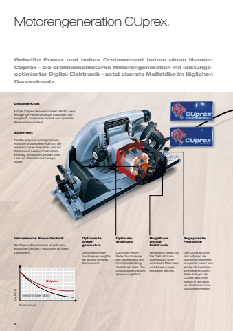8Motorengeneration CUprex.Geballte Power und hohes Drehmoment haben einen Namen: CUprex %u2013 die drehmomentstarke Motorengeneration mit leistungsoptimierter Digital-Elektronik %u2013 setzt oberste Ma%u00dfst%u00e4be im t%u00e4glichen Dauereinsatz.Geballte KraftMit der CUprex Generation bietet MAFELL eine einzigartige Performance aus maximaler Leistungskraft, modernster Technik und optimaler Bedienerfreundlichkeit.SicherheitDie Steuertechnik erm%u00f6glicht mehr Kontrolle und besseren Komfort. Die meisten CUprex Maschinen sind mit Sanftanlauf, Leerlauf-Drehzahlabsenkung, konstanter Drehzahl unter Last und %u00dcberlastschutz ausgestattet.Angepasste Feldgr%u00f6%u00dfeDie CUprex Motoren sind aufgrund der optimierten Bauweise kompakter, k%u00fcrzer und leichter als herk%u00f6mmliche Serienmotoren. Dadurch liegen die CUprex Maschinen optimal in der Hand und f%u00f6rdern ein erm%u00fcdungsfreies Arbeiten.Optimierte AnkergeometrieDer gr%u00f6%u00dfere Ankerdurchmesser sorgt f%u00fcr ein sp%u00fcrbar h%u00f6heres Drehmoment.Optimale WicklungDurch den vergr%u00f6%u00dferten Durchmesser des Kupferdrahts wird eine Verlustleistung deutlich reduziert. Das Leistungspotenzial wirdsp%u00fcrbar vergr%u00f6%u00dfert.Regelbare DigitalElektronikVerbesserte Steuerung:Die Drehzahl kann stufenlos auf unterschiedliche Materialien und Anwendungen eingestellt werden. Verbesserte SteuertechnikDie CUprex Steuertechnik sorgt f%u00fcr eine konstante Drehzahl %u2013 besonders im hohen Lastbereich.DrehzahlDrehmomentherk%u00f6mmlicher Motor