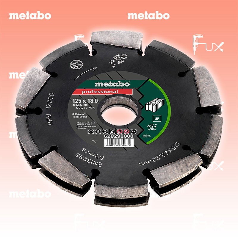 Zu "Mauernutfräse " von Metabo Metabo Dia-FS3, 125x18x22.23 mm "Professional" UP Bestell- und Artikelnummer: 628298000 Schnelles und komfortables Fräsen von Mauerschlitzen in vielfältigen Materialien möglich Hohe Arbeitserleichterung, durch das intelligente System aus verschränkt angeordneten Segmenten, da Herausstemmen des Mittelstegs entfällt. Hohe Zeitersparnis durch Fräsen in einem Arbeitsgang Reduzierung von Schmutz und Staub, da das Material sauber und vollständig aus dem Schlitz entfernt wird Passgenaue Schlitze für Einzelleitungen Ø 12 mm, oder für Ø 20 und 25 mm-Leerrohre. Max. Schnittbreite: 20 mm (2-reihig) bzw. 30 mm (3-reihig) Technische Daten Durchmesser x Bohrung 125 x 22.23 mm Segmentabmessungen 18 x 7 mm Segmentanzahl 20 Max. Drehzahl 12200 /min Standard-Ausrüstung Verkaufseinheit 1 Listenpreis CHF 208.00 Fuxpreis CHF 177.00 inkl. 8.1% MwSt, inkl vRG Frankolieferung Kein Grauimport! Produkt bestellen Verkaufseinheit 1 1 Stück 2 Stück 3 Stück 4 Stück 5 Stück 6 Stück 7 Stück 8 Stück 9 Stück 10 Stück 11 Stück 12 Stück 13 Stück 14 Stück 15 Stück 16 Stück 17 Stück 18 Stück 19 Stück 20 Stück 21 Stück 22 Stück 23 Stück 24 Stück 25 Stück 26 Stück 27 Stück 28 Stück 29 Stück 30 Stück 31 Stück 32 Stück 33 Stück 34 Stück 35 Stück 36 Stück 37 Stück 38 Stück 39 Stück 40 Stück 41 Stück 42 Stück 43 Stück 44 Stück 45 Stück 46 Stück 47 Stück 48 Stück 49 Stück 50 Stück Alle Angaben ohne Gewähr und solange Vorrat reicht!Wiederverkäufer werden?Lehrlingsrabatt? Produkt als PDF AKTION 15%