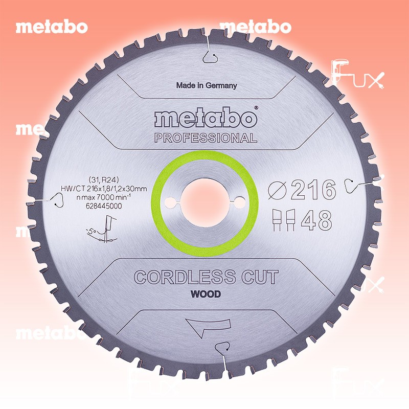 Zu "Kreissägeblätter »cordless cut« wood " von Metabo Metabo Kreissägeblatt 216 mm professional Bestell- und Artikelnummer: 628444000 Maximale Laufzeit für Akku-Sägen durch extra dünne Stammblattdicke und Schnittbreite Deutlich mehr Schnitte pro Akkuladung im Vergleich zu Standard-Sägeblättern bei gleich hoher Standzeit Besonders hohe Standzeit durch beste Hartmetallqualität und feingeschliffene Zähne Präzise, geräuscharme und vibrationsminimierte Schnitte durch gelaserte Dehnschlitze (und teilweise Laserornamente), sowie gelaserte Stammblätter aus hochwertigstem Stahl Zum Kreissägeblatt-Finder Technische Daten Durchmesser x Schnittbreite x Bohrung 216 x 1.8 x 30 mm Material HW/CT Zähnezahl 28 Zahnform WZ Stammblattdicke 1.2 mm Spanwinkel 5° neg. geeignet für KS 18 LTX 216 / KGS 18 LTX 216 Verpackung Karton Standard-Ausrüstung Verkaufseinheit 1 Stk. Geliefert im Karton Listenpreis CHF 98.50 Fuxpreis CHF 84.00 inkl. 8.1% MwSt, inkl vRG Versand CHF 15.00 Kein Grauimport! Produkt bestellen Verkaufseinheit 1 Stk. 1 Stück 2 Stück 3 Stück 4 Stück 5 Stück 6 Stück 7 Stück 8 Stück 9 Stück 10 Stück 11 Stück 12 Stück 13 Stück 14 Stück 15 Stück 16 Stück 17 Stück 18 Stück 19 Stück 20 Stück 21 Stück 22 Stück 23 Stück 24 Stück 25 Stück 26 Stück 27 Stück 28 Stück 29 Stück 30 Stück 31 Stück 32 Stück 33 Stück 34 Stück 35 Stück 36 Stück 37 Stück 38 Stück 39 Stück 40 Stück 41 Stück 42 Stück 43 Stück 44 Stück 45 Stück 46 Stück 47 Stück 48 Stück 49 Stück 50 Stück Alle Angaben ohne Gewähr und solange Vorrat reicht!Wiederverkäufer werden?Lehrlingsrabatt? Produkt als PDF AKTION 15%