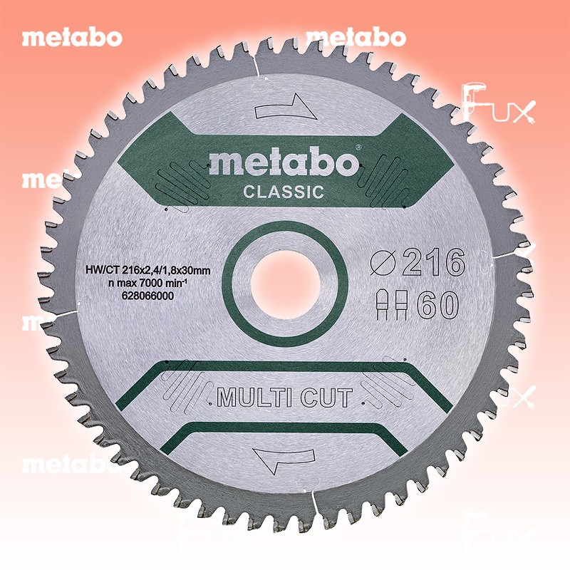 Zu "Kreissägeblätter »multi cut« " von Metabo Metabo Kreissägeblatt 254 mm classic Bestell- und Artikelnummer: 628285000 Universeller Einsatz bei anspruchsvollen Materialien Bei hohen Ansprüchen an die Schnittqualität, z.B. Laminat, dünnwandige Kunststoff-, Alu-, Kupfer-, Messingprofile Geeignet für viele Anwendungen im Innenausbau Gute Schnittergebnisse auch bei Querschnitten in Vollholz, rohen, beschichteten oder furnierten Spanplatten, MDF Sehr hohe Leistungskraft der Kreissäge notwendig Zum Kreissägeblatt-Finder Technische Daten Durchmesser x Schnittbreite x Bohrung 254 x 2.6 x 30 mm Material HW/CT Zähnezahl 60 Zahnform FZ/TZ Stammblattdicke 1.8 mm Spanwinkel 5° neg. geeignet für KS 254 Plus / KGS 254 M / KGS 254 Plus / KGS 254 I Plus Verpackung Karton Standard-Ausrüstung Verkaufseinheit 1 Stk. Geliefert im Karton Listenpreis CHF 71.50 Fuxpreis CHF 61.00 inkl. 8.1% MwSt, inkl vRG Versand CHF 15.00 Kein Grauimport! Produkt bestellen Verkaufseinheit 1 Stk. 1 Stück 2 Stück 3 Stück 4 Stück 5 Stück 6 Stück 7 Stück 8 Stück 9 Stück 10 Stück 11 Stück 12 Stück 13 Stück 14 Stück 15 Stück 16 Stück 17 Stück 18 Stück 19 Stück 20 Stück 21 Stück 22 Stück 23 Stück 24 Stück 25 Stück 26 Stück 27 Stück 28 Stück 29 Stück 30 Stück 31 Stück 32 Stück 33 Stück 34 Stück 35 Stück 36 Stück 37 Stück 38 Stück 39 Stück 40 Stück 41 Stück 42 Stück 43 Stück 44 Stück 45 Stück 46 Stück 47 Stück 48 Stück 49 Stück 50 Stück Alle Angaben ohne Gewähr und solange Vorrat reicht!Wiederverkäufer werden?Lehrlingsrabatt? Produkt als PDF AKTION 15%