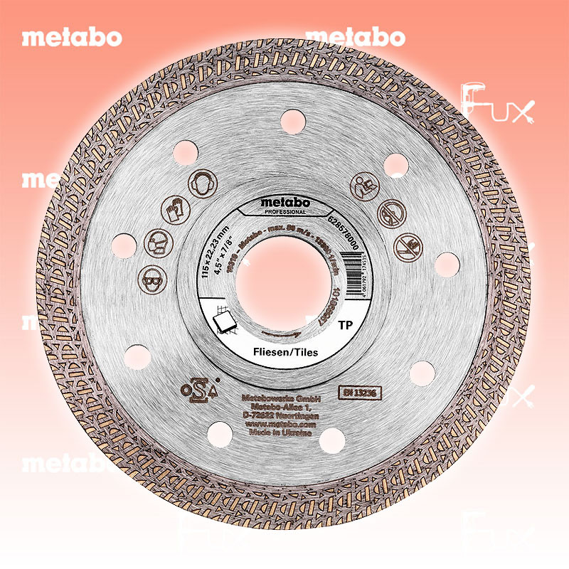 Zu "Qualitätsklasse »professional« / TP" von Metabo Metabo Diamanttrennscheibe 115 mm Bestell- und Artikelnummer: 628578000 Spezialscheibe für alle Arten von Fliesen, glasiert und unglasiert, Natursteinplatten, Feinsteinzeug Die Spezialgeometrie ermöglicht höchste Schnittgeschwindigkeiten und gute Schnittkanten Extra dünner Stahlkern; mit Stahlkernverstärkung Gesinterter Schneidrand; Segmenthöhe: 10 mm Technische Daten Durchmesser x Bohrung 115 x 22.23 mm Segmentabmessungen 1,4 x 10 mm Max. Drehzahl 13300 /min Standard-Ausrüstung Verkaufseinheit 1 Stk. Listenpreis CHF 47.00 Fuxpreis CHF 40.00 inkl. 8.1% MwSt, inkl vRG Versand CHF 15.00 Kein Grauimport! Produkt bestellen Verkaufseinheit 1 Stk. 1 Stück 2 Stück 3 Stück 4 Stück 5 Stück 6 Stück 7 Stück 8 Stück 9 Stück 10 Stück 11 Stück 12 Stück 13 Stück 14 Stück 15 Stück 16 Stück 17 Stück 18 Stück 19 Stück 20 Stück 21 Stück 22 Stück 23 Stück 24 Stück 25 Stück 26 Stück 27 Stück 28 Stück 29 Stück 30 Stück 31 Stück 32 Stück 33 Stück 34 Stück 35 Stück 36 Stück 37 Stück 38 Stück 39 Stück 40 Stück 41 Stück 42 Stück 43 Stück 44 Stück 45 Stück 46 Stück 47 Stück 48 Stück 49 Stück 50 Stück Alle Angaben ohne Gewähr und solange Vorrat reicht!Wiederverkäufer werden?Lehrlingsrabatt? Produkt als PDF AKTION 15%