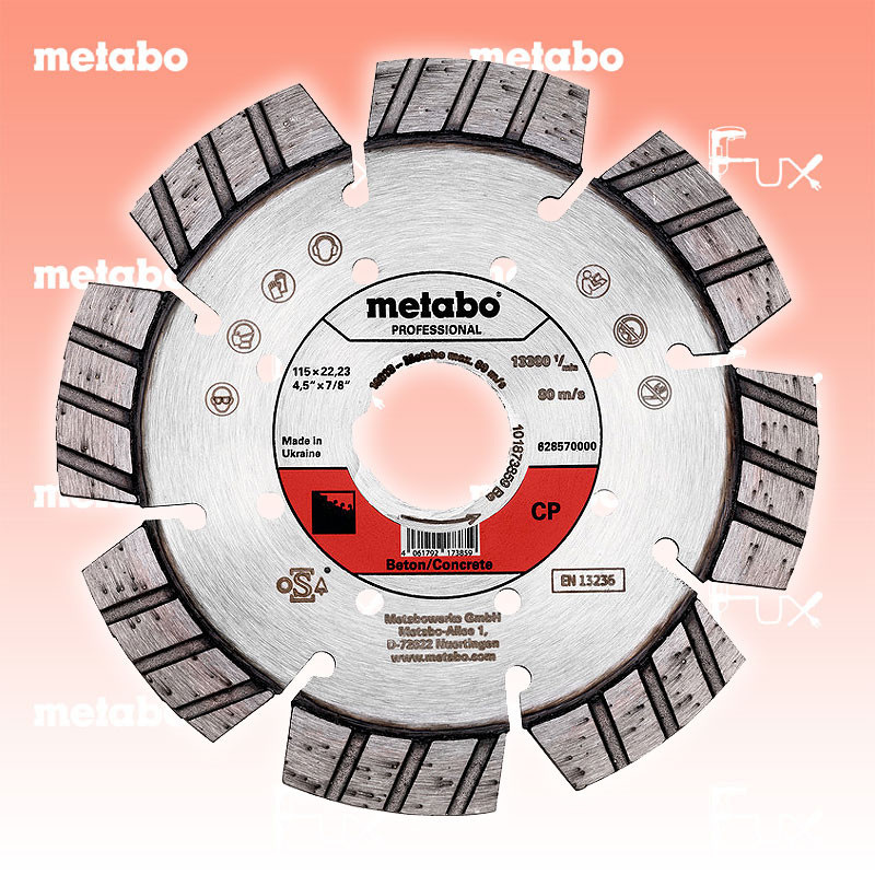 Zu "Qualitätsklasse »professional« / CP " von Metabo Metabo Diamanttrennscheibe 115 mm Bestell- und Artikelnummer: 628570000 Ideal für alle harten Materialien, wie Beton (auch armiert), Betonrohre, Bordsteine, harte Sandsteine, Verbundsteine, Waschbeton Hochwertige Diamantqualität und hochwertige Rohstoffe für optimale Schnittleistung und hohe Standzeit Spezielle Turbosegmente für sehr hohe Schnittgeschwindigkeit in nahezu allen Materialien Laserverschweißte Diamantsegmente; Segmenthöhe: 12 mm Technische Daten Durchmesser x Bohrung 115 x 22.23 mm Segmentabmessungen 33 x 2,4 x 12 Segmentanzahl 8 Max. Drehzahl 13300 /min Standard-Ausrüstung Verkaufseinheit 1 Stk. Listenpreis CHF 36.50 Fuxpreis CHF 31.00 inkl. 8.1% MwSt, inkl vRG Versand CHF 15.00 Kein Grauimport! Produkt bestellen Verkaufseinheit 1 Stk. 1 Stück 2 Stück 3 Stück 4 Stück 5 Stück 6 Stück 7 Stück 8 Stück 9 Stück 10 Stück 11 Stück 12 Stück 13 Stück 14 Stück 15 Stück 16 Stück 17 Stück 18 Stück 19 Stück 20 Stück 21 Stück 22 Stück 23 Stück 24 Stück 25 Stück 26 Stück 27 Stück 28 Stück 29 Stück 30 Stück 31 Stück 32 Stück 33 Stück 34 Stück 35 Stück 36 Stück 37 Stück 38 Stück 39 Stück 40 Stück 41 Stück 42 Stück 43 Stück 44 Stück 45 Stück 46 Stück 47 Stück 48 Stück 49 Stück 50 Stück Alle Angaben ohne Gewähr und solange Vorrat reicht!Wiederverkäufer werden?Lehrlingsrabatt? Produkt als PDF AKTION 15%