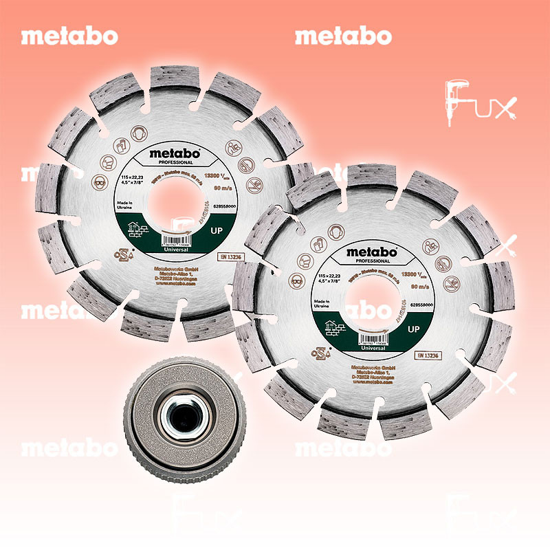 Zu "Diamanttrennscheiben SET "UP"" von Metabo Metabo Diamanttrennscheibe 115 mm Bestell- und Artikelnummer: 628581000 Bestens geeignet für alle allgemeinen Bau-/ und Baustellenmaterialien, wie Beton, Waschbeton, harte/ weiche Sandsteine, Tonziegel Die Universalscheibe mit der hochwertigen Diamantqualität und hochwertigen Rohstoffen für optimale Schnittleistung und hohe Standzeit Spezielle Kurzzahnsegmente für hohe Schnittfreudigkeit und saubere Schnittkanten Laserverschweißte Diamantsegmente; Segmenthöhe: 9 mm Technische Daten Durchmesser x Bohrung 115 x 22.23 mm Segmentabmessungen 20 x 2.4 x 9 mm Segmentanzahl 13 Max. Drehzahl 13300 /min Standard-Ausrüstung Verkaufseinheit 2 Stk. Quickspannmutter M14 Listenpreis CHF 62.00 Fuxpreis CHF 53.00 inkl. 8.1% MwSt, inkl vRG Versand CHF 15.00 Kein Grauimport! Produkt bestellen Verkaufseinheit 2 Stk. Quickspannmutter M14 1 Stück 2 Stück 3 Stück 4 Stück 5 Stück 6 Stück 7 Stück 8 Stück 9 Stück 10 Stück 11 Stück 12 Stück 13 Stück 14 Stück 15 Stück 16 Stück 17 Stück 18 Stück 19 Stück 20 Stück 21 Stück 22 Stück 23 Stück 24 Stück 25 Stück 26 Stück 27 Stück 28 Stück 29 Stück 30 Stück 31 Stück 32 Stück 33 Stück 34 Stück 35 Stück 36 Stück 37 Stück 38 Stück 39 Stück 40 Stück 41 Stück 42 Stück 43 Stück 44 Stück 45 Stück 46 Stück 47 Stück 48 Stück 49 Stück 50 Stück Alle Angaben ohne Gewähr und solange Vorrat reicht!Wiederverkäufer werden?Lehrlingsrabatt? Produkt als PDF AKTION 15%