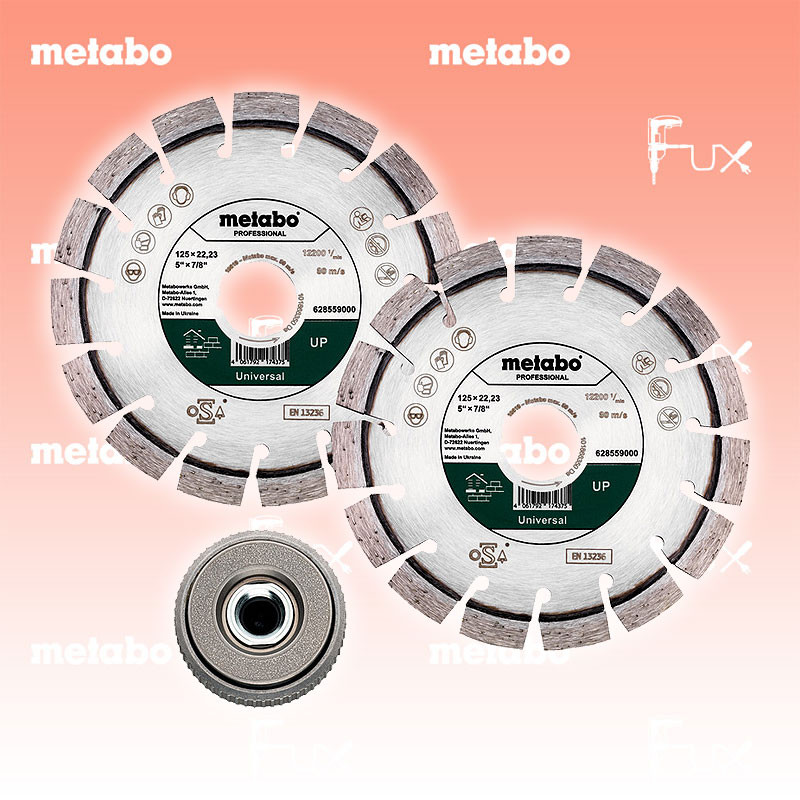 Zu "Diamanttrennscheiben SET "UP"" von Metabo Metabo Diamanttrennscheibe 125 mm Bestell- und Artikelnummer: 628582000 Bestens geeignet für alle allgemeinen Bau-/ und Baustellenmaterialien, wie Beton, Waschbeton, harte/ weiche Sandsteine, Tonziegel Die Universalscheibe mit der hochwertigen Diamantqualität und hochwertigen Rohstoffen für optimale Schnittleistung und hohe Standzeit Spezielle Kurzzahnsegmente für hohe Schnittfreudigkeit und saubere Schnittkanten Laserverschweißte Diamantsegmente; Segmenthöhe: 9 mm Technische Daten Durchmesser x Bohrung 125 x 22.23 mm Segmentabmessungen 20 x 2.4 x 9 mm Segmentanzahl 15 Max. Drehzahl 12200 /min Standard-Ausrüstung Verkaufseinheit 2 Stk. Quickspannmutter M14 Listenpreis CHF 67.00 Fuxpreis CHF 57.00 inkl. 8.1% MwSt, inkl vRG Versand CHF 15.00 Kein Grauimport! Produkt bestellen Verkaufseinheit 2 Stk. Quickspannmutter M14 1 Stück 2 Stück 3 Stück 4 Stück 5 Stück 6 Stück 7 Stück 8 Stück 9 Stück 10 Stück 11 Stück 12 Stück 13 Stück 14 Stück 15 Stück 16 Stück 17 Stück 18 Stück 19 Stück 20 Stück 21 Stück 22 Stück 23 Stück 24 Stück 25 Stück 26 Stück 27 Stück 28 Stück 29 Stück 30 Stück 31 Stück 32 Stück 33 Stück 34 Stück 35 Stück 36 Stück 37 Stück 38 Stück 39 Stück 40 Stück 41 Stück 42 Stück 43 Stück 44 Stück 45 Stück 46 Stück 47 Stück 48 Stück 49 Stück 50 Stück Alle Angaben ohne Gewähr und solange Vorrat reicht!Wiederverkäufer werden?Lehrlingsrabatt? Produkt als PDF AKTION 15%