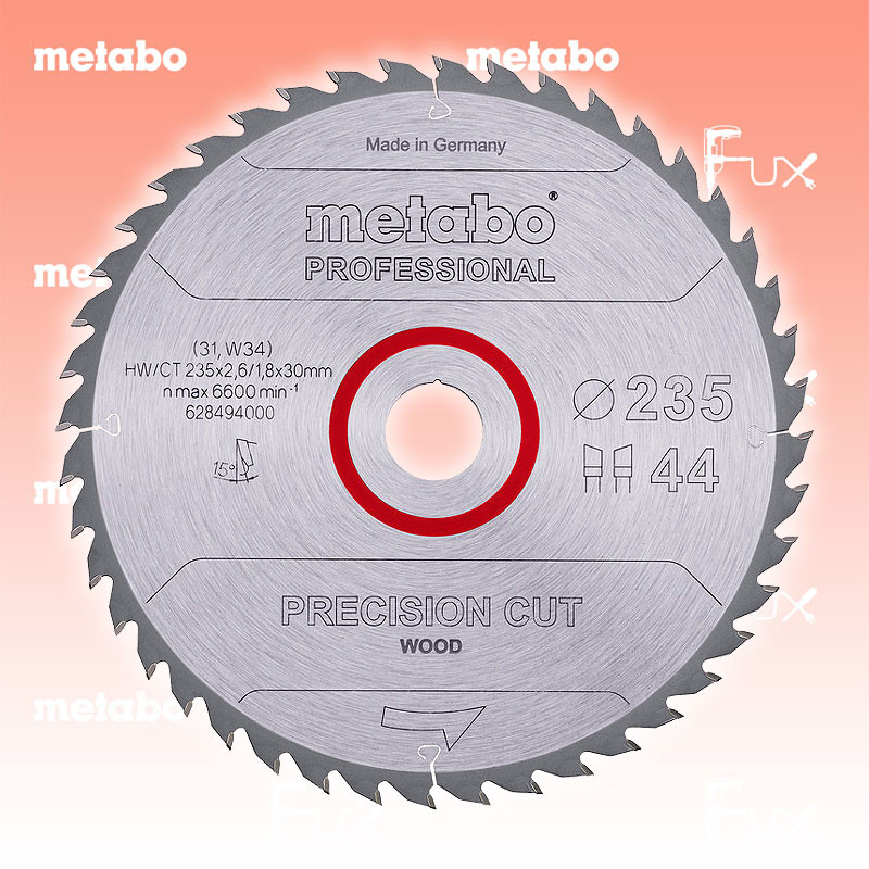 Zu "Kreissägeblätter »precision cut« wood" von Metabo Metabo Kreissägeblatt 235 mm professional Bestell- und Artikelnummer: 628494000 Sehr breites Einsatzspektrum in der Holzbearbeitung Für sehr gute, saubere Schnittergebnisse bei Längs- und Querschnitten in Weich- und Hartholz Perfekt geeignet für Voll- und Schichtholz, Spanplatten roh, beschichtet oder furniert, MDF, Verbundwerkstoffe Höhere Leistungskraft der Kreissäge notwendig Besonders hohe Standzeit durch beste Hartmetallqualität und feingeschliffene Zähne Präzise, geräuscharme und vibrationsminimierte Schnitte durch gelaserte Dehnschlitze (und teilweise Laserornamente), sowie gelaserte Stammblätter aus hochwertigstem Stahl Zum Kreissägeblatt-Finder Technische Daten Durchmesser x Schnittbreite x Bohrung 235 x 2.6 x 30 mm Material HW/CT Zähnezahl 44 Zahnform WZ Stammblattdicke 1.8 mm Spanwinkel 15° Verpackung Karton Standard-Ausrüstung Verkaufseinheit 1 Stk. Geliefert im Karton Listenpreis CHF 109.50 Fuxpreis CHF 93.00 inkl. 8.1% MwSt, inkl vRG Versand CHF 15.00 Kein Grauimport! Produkt bestellen Verkaufseinheit 1 Stk. 1 Stück 2 Stück 3 Stück 4 Stück 5 Stück 6 Stück 7 Stück 8 Stück 9 Stück 10 Stück 11 Stück 12 Stück 13 Stück 14 Stück 15 Stück 16 Stück 17 Stück 18 Stück 19 Stück 20 Stück 21 Stück 22 Stück 23 Stück 24 Stück 25 Stück 26 Stück 27 Stück 28 Stück 29 Stück 30 Stück 31 Stück 32 Stück 33 Stück 34 Stück 35 Stück 36 Stück 37 Stück 38 Stück 39 Stück 40 Stück 41 Stück 42 Stück 43 Stück 44 Stück 45 Stück 46 Stück 47 Stück 48 Stück 49 Stück 50 Stück Alle Angaben ohne Gewähr und solange Vorrat reicht!Wiederverkäufer werden?Lehrlingsrabatt? Produkt als PDF AKTION 15%