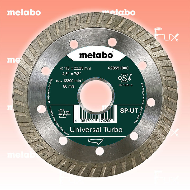 Zu "Qualitätsklasse »Universal« Turbo "SP"" von Metabo Metabo Diamanttrennscheibe 115 mm Bestell- und Artikelnummer: 628551000 Gut geeignet für alle Bau-/ und Baustellenmaterialien, wie Beton, Waschbeton, harte Sandsteine, Tonziegel Der umlaufende, geschlossene Schneidrand sorgt für saubere Schnittkanten ohne Materialausbrüche Gute Schnittleistung und optimale Standzeit Gesinterter Schneidrand, Segmenthöhe: 10 mm Technische Daten Durchmesser x Bohrung 115 x 22.23 mm Segmentabmessungen 2.2 x 10 mm Max. Drehzahl 13300 /min Standard-Ausrüstung Verkaufseinheit 1 Stk. Listenpreis CHF 12.00 Fuxpreis CHF 10.20 inkl. 8.1% MwSt, inkl vRG Versand CHF 15.00 Kein Grauimport! Produkt bestellen Verkaufseinheit 1 Stk. 1 Stück 2 Stück 3 Stück 4 Stück 5 Stück 6 Stück 7 Stück 8 Stück 9 Stück 10 Stück 11 Stück 12 Stück 13 Stück 14 Stück 15 Stück 16 Stück 17 Stück 18 Stück 19 Stück 20 Stück 21 Stück 22 Stück 23 Stück 24 Stück 25 Stück 26 Stück 27 Stück 28 Stück 29 Stück 30 Stück 31 Stück 32 Stück 33 Stück 34 Stück 35 Stück 36 Stück 37 Stück 38 Stück 39 Stück 40 Stück 41 Stück 42 Stück 43 Stück 44 Stück 45 Stück 46 Stück 47 Stück 48 Stück 49 Stück 50 Stück Alle Angaben ohne Gewähr und solange Vorrat reicht!Wiederverkäufer werden?Lehrlingsrabatt? Produkt als PDF AKTION 15%