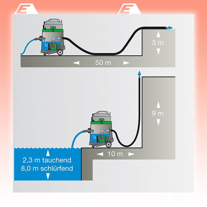 Zu "Pumpsauger" von Eibenstock Eibenstock EPS 50 Pumpsauger Bestell- und Artikelnummer: 09927000 Anwendung: Aufsaugen und gleichzeitiges Abpumpen von Wasser bis 9 m Höhe Auf Baustellen, bei Hochwasser, Brandsanierung, Leitungsschäden, Flachdachsanierung, Teich- oder Poolreinigung und anderen Reinigungsaufgaben Für Dachdecker, Baubetriebe, Feuerwehr, THW, Hausmeisterdienstleistungen, Wohnungsbaugesellschaften Merkmale: Besonders robuster Behälter aus schlagfestem Kunststoff Leistungsstarke Pumpe mit bis zu 14.000 Liter/h Förderleistung Separates Filternetz für Grobpartikel 10 m Schmutzwasserschlauch mit C-Rohr Anschluss Auch für reinen Saugerbetrieb (Nasssaugen) geeignet Hohe Sicherheit durch PRCD-Schutzschalter Technische Daten Leistungsaufnahme Sauger 1.300 W Leistungsaufnahme Pumpe 900 W Nennspannung 230 V~ Behältervolumen (brutto) 50 l max. Luftstrom 70 l/s max. Unterdruck 230 mbar Förderleistung 14000 l/h Max. Förderhöhe 9 m Abwasseranschluss C-Rohr Schlauchlänge Sauger 7 m Schlauchlänge Abwasser 10 m Gewicht 15 kg Standard-Ausrüstung 4 x 0,5 m Kunststoffsaugrohre ø 38 mm, 7 m Saugschlauch, 10 m Schmutzwasserschlauch, Integrierte Schmutzwasserpumpe, Filternetz mit Reißverschluss, Teichdüse, Fugendüse, Bürstendüse, Nassbodendüse 360 mm breit Listenpreis CHF 1'751.20 Fuxpreis CHF 1'401.00 inkl. 8.1% MwSt, inkl vRG Frankolieferung Kein Grauimport! Produkt bestellen 1 Stück 2 Stück 3 Stück 4 Stück 5 Stück 6 Stück 7 Stück 8 Stück 9 Stück 10 Stück Alle Angaben ohne Gewähr und solange Vorrat reicht!Lehrlingsrabatt? Produkt als PDF AKTION 20%