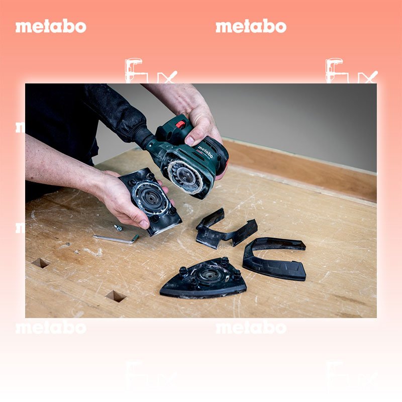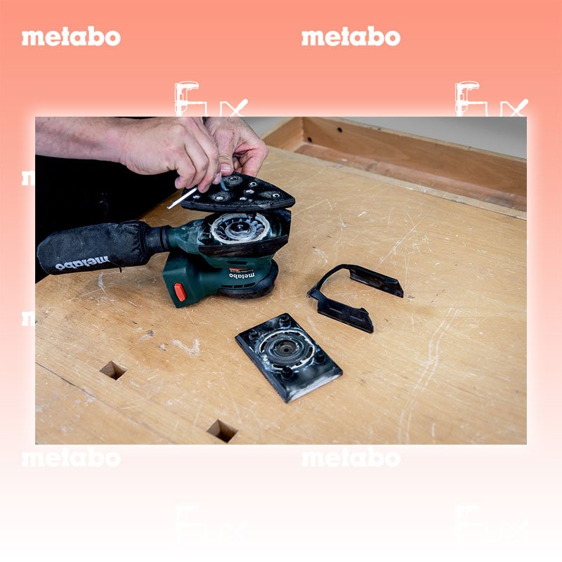 - Zum Schleifen von Ecken und Kanten kann die mitgelieferte dreieckige Schleifplatte montiert werden