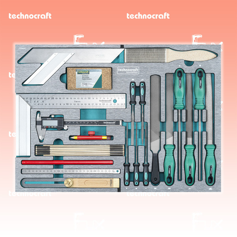 Bestückt mit diversen Feilen, Schlüsselfeilen, Anschlag-Schreinerwinkel, Feilenbürste und Messwerkzeugen