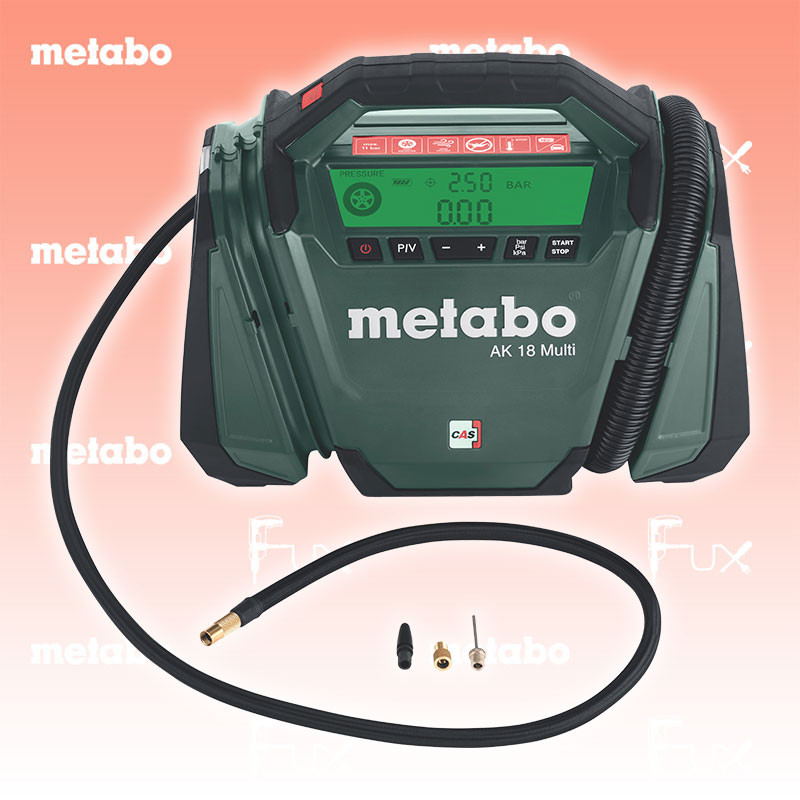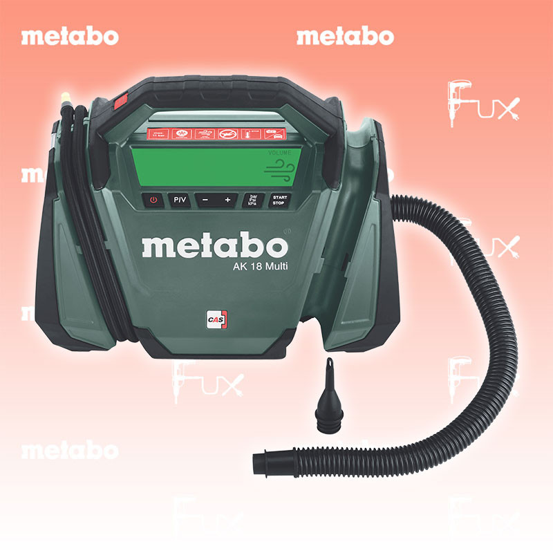 Zu "Akku Kompressor " von Metabo FULL Service: 36 Monate zum Nulltarif für Sie! Weitere Infos zum FULL Service Metabo AK 18 Multi Akku Komressor Bestell- und Artikelnummer: 600794850 Multifunktionaler Akku-Kompressor, vielseitig einsetzbar zum Aufpumpen von Reifen, Bällen, Luftmatratzen und mehr Hochdruckfunktion für komfortables Aufpumpen von Auto und Fahrradreifen Volumenfunktion zum schnellen Befüllen und Entlüften von aufblasbaren Produkten wie Gästebett, Luftmatratzen und Poolzubehör Großes, kontrastreiches Display zeigt ausgewählte Funktion, aktuellen Druck und eingestellten Zieldruck an Der Druck kann in den Einheiten bar, psi und kPa angezeigt werden Automatische Abschaltung beim Erreichen des eingestellten Zieldrucks Helles LED-Licht zum Ausleuchten des Einsatzbereichs bei Dunkelheit oder schlechter Sicht Betrieb mit 18V-Akkupacks oder alternativ über ein 12V-KFZ-Kabel Viele Marken, ein Akku-System: Dieses Produkt ist kombinierbar mit allen 18V-Akkupacks und Ladegeräten der CAS Marken: www.cordless-alliance-system.com Ergattere dir einen Akku bei der Registration auf metabo.ch Alle Produkte dieser Aktion anzeigen OHNE AKKUS UND LADEGERÄT Technische Daten Akkuspannung 18 V Füllleistung 16 l/min Max. Druck 11 bar Länge Hochdruckschlauch 1.200 mm Länge Volumenschlauch 490 mm Abmessungen 328 x 185 x 256 mm Gewicht ohne Akkupack 2,6 kg Gewicht mit Akkupack 3,6 kg Standard-Ausrüstung Volumenschlauch mit 2 Adaptern Universal-Hochdruckadapter Hochdruckadapter für Fahrradventil Ballfüllnadel 12V-KFZ-Kabel Zubehör Listenpreis CHF 189.00 Fuxpreis CHF 161.00 inkl. 8.1% MwSt, inkl vRG Frankolieferung Kein Grauimport! Produkt bestellen 1 Stück 2 Stück 3 Stück 4 Stück 5 Stück 6 Stück 7 Stück 8 Stück 9 Stück 10 Stück Alle Angaben ohne Gewähr und solange Vorrat reicht!Wiederverkäufer werden?Lehrlingsrabatt? Produkt als PDFVideo LiHD 1Video LiHD 2 AKTION 15%