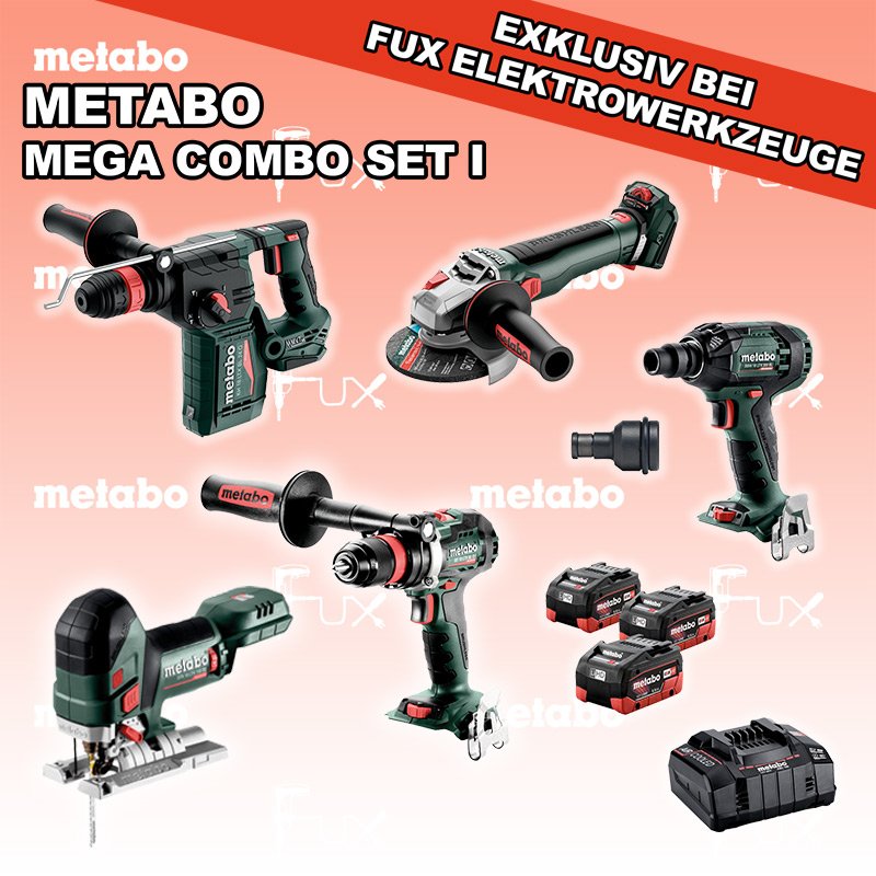 Zu "Combo Set 18 Volt " von Metabo FULL Service: 36 Monate zum Nulltarif für Sie! Weitere Infos zum FULL Service Dieses Produkt ist CAS kompatibel! Weitere Infos zu CAS FUX SPECIAL EXKLUSIV BEI FUX Metabo Mega Combo Set 1 Bestell- und Artikelnummer: Mega Combo Set 1 STA 18 LTX 150 BL Akku-StichsägeAkkuspannung 18 V Hubzahl 1.000-3.500 /min Gewicht ohne Akkupack 1,9 kgInfos KH 18 LTX BL 24 Q Akku-KombihammerAkkuspannung 18 V Einzelschlagstärke 2.2 J Bohrleistung in Beton 24 mm Gewicht ohne Akkupack 3 kgInfos BS 18 LTX BL Q I Akku-BohrschrauberAkkuspannung 18 V Drehzahl 0-550 / 0-2000 U/min Drehmoment hart / weich 130 / 65 Nm Gewicht (mit Akkupack) 2.3 kgInfos WVB 18 LT BL 11-125 Quick Akku-WinkelschleiferAkkuspannung 18 V Drehzahl 2.800 - 10.000 / min Ø 125 mm Scheiben Gewicht (mit Akkupack) 2.5 kgInfos SSW 18 LTX 300 BL Akku-SchlagschrauberAkkuspannung 18 V Anziehdrehmoment 300 Nm Werkzeugaufnahme 1/2" Gewicht 1.7 kgInfos Basis-Set 5.5 Ah LiHD 3x AkkupackBasis-Set 18 Volt 5.5 Ah LiHD 3x Akkupack 5.5 Ah ( LiHD Akkus ) Ladegerät ASC 30-36 VInfos Reduktions Adapter 1/2" auf 1/4" Aufnahme Max. 350 Nm Länge 45 mmInfos Standard-Ausrüstung In diesem Set enthalten: STA 18 LTX 150 BL Akku-Stichsäge KH 18 LTX BL 24 Q Akku-Kombihammer BS 18 LTX BL Q I Akku-Bohrschrauber WVB 18 LT BL 11-125 Quick Akku-Winkelschleifer SSW 18 LTX 300 BL Akku-Schlagschrauber Basis-Set 5.5 Ah LiHD 3x Akkupack Reduktions Adapter Geliefert im Koffer Zubehör Verbrauchsmaterial Listenpreis CHF 2'189.00 Fuxpreis CHF 1'210.00 inkl. 8.1% MwSt, inkl vRG Frankolieferung Kein Grauimport! Produkt bestellen 1 Stück 2 Stück 3 Stück 4 Stück 5 Stück 6 Stück 7 Stück 8 Stück 9 Stück 10 Stück Alle Angaben ohne Gewähr und solange Vorrat reicht!Wiederverkäufer werden? Produkt als PDFVideo LiHD 1Video LiHD 2 AKTION 44%