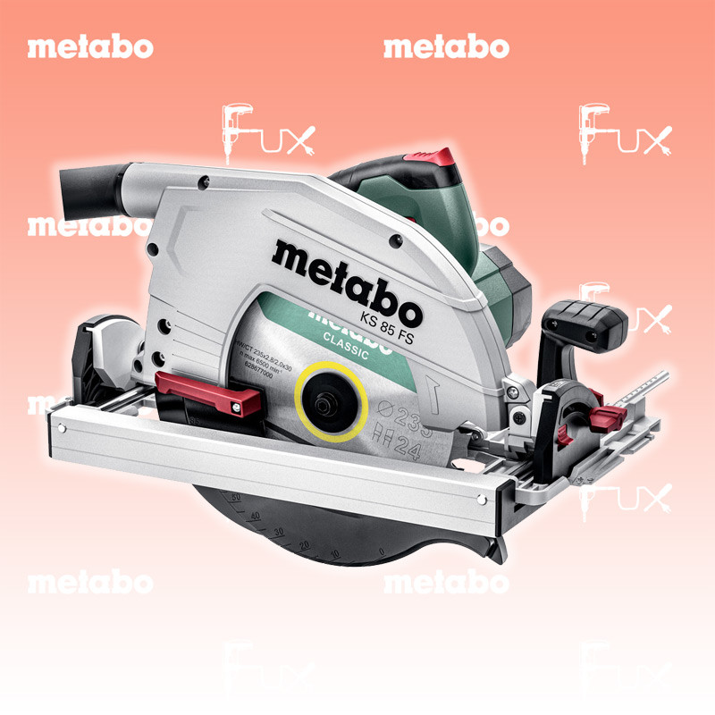 Zu "Handkreissägen" von Metabo Metabo KS 85 FS Handkreissäge Bestell- und Artikelnummer: 601085520 Robuste Handkreissäge, direkt einsetzbar auf Führungsschienen von Metabo und anderen Herstellern für präzise, lange Schnitte Schnelle, exakte Kappschnitte durch einfaches Koppeln mit einer Metabo Kappschiene KFS (Zubehör) Leichte Führungsplatte aus Aluminiumdruckguss Griffbereich mit rutschfester Softgrip-Oberfläche Präziser, doppelt geführter Aluminium-Parallelanschlag erleichtert Ablängschnitte Gut sichtbarer Schnittanzeiger zum Sägen nach Anriss 0°-Position nachjustierbar für höchste Schnittgenauigkeit Absaugmöglichkeit durch Anschluss eines Allessaugers Späneauswurf lenkbar durch drehbaren Absaugstutzen Abschaltkohlebürsten zum Schutz des Motors Führungsschiene als Zubehör lieferbar Technische Daten Nennaufnahmeleistung 2000 W Abgabeleistung 1100 W Max. Schnitttiefe bei 90° 85 mm Max. Schnitttiefe bei 45° 65 mm Max. Schnitttiefe mit Führungsschiene 80 mm Sägeblatt-Ø x Bohrung 235 x 30 mm Schwenkbereich von/bis 0 / + 48 ° Leerlaufdrehzahl 4500 /min Drehzahl bei Nennlast 3800 /min Max. Schnittgeschwindigkeit 55 m/s Kabellänge 4 m Gewicht ohne Netzkabel 8.4 kg Standard-Ausrüstung Hartmetall-Kreissägeblatt (24 Zähne) Aluminium-Parallelanschlag Sechskantschlüssel Kunststoffkoffer Geliefert im Koffer Zubehör Verbrauchsmaterial Listenpreis CHF 419.00 Fuxpreis CHF 356.00 inkl. 8.1% MwSt, inkl vRG Frankolieferung Kein Grauimport! Produkt bestellen 1 Stück 2 Stück 3 Stück 4 Stück 5 Stück 6 Stück 7 Stück 8 Stück 9 Stück 10 Stück Alle Angaben ohne Gewähr und solange Vorrat reicht!Wiederverkäufer werden?Lehrlingsrabatt? Produkt als PDF 360° Ansicht AKTION 15%