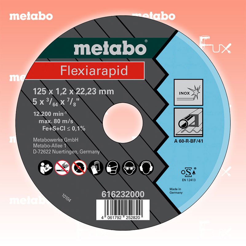 Zu "Qualitätsklasse A 60-R / A 46-R / A 30-R Trennscheiben" von Metabo Metabo Metabo Trennscheibe Stahl 125 mm Bestell- und Artikelnummer: 616232000 Dünne Hochleistungsscheibe speziell für rostfreie, dünnwandige Materialien wie z. B. Rohre, Bleche, Profile, Drähte Härte: hart Sehr hohe Schnittleistung bei hoher Standzeit durch Verwendung von Spezialkorunden Geringer Materialverbrauch, kraftsparend, geringe Maschinenbelastung Eisen-, schwefel- und chlorfrei (Fe + S + Cl ≤ 0,1 %) Arbeitshöchstgeschwindigkeit 80 m/s A 60-R bei 1 mm Stärke; A 46-R bei 1,6 mm Stärke; A 30-R bei 1,9 mm Stärke Technische Daten Qualitätsklasse A 60-R Durchmesser x Dicke x Bohrung 125 x 1.2 x 22.23 mm Ausführung gerade Max. Drehzahl 12200 /min Standard-Ausrüstung Verkaufseinheit 25 Stk. Listenpreis CHF 100.00 Fuxpreis CHF 85.00 inkl. 8.1% MwSt, inkl vRG Versand CHF 15.00 Kein Grauimport! Produkt bestellen Verkaufseinheit 25 Stk. 1 Stück 2 Stück 3 Stück 4 Stück 5 Stück 6 Stück 7 Stück 8 Stück 9 Stück 10 Stück 11 Stück 12 Stück 13 Stück 14 Stück 15 Stück 16 Stück 17 Stück 18 Stück 19 Stück 20 Stück 21 Stück 22 Stück 23 Stück 24 Stück 25 Stück 26 Stück 27 Stück 28 Stück 29 Stück 30 Stück 31 Stück 32 Stück 33 Stück 34 Stück 35 Stück 36 Stück 37 Stück 38 Stück 39 Stück 40 Stück 41 Stück 42 Stück 43 Stück 44 Stück 45 Stück 46 Stück 47 Stück 48 Stück 49 Stück 50 Stück Alle Angaben ohne Gewähr und solange Vorrat reicht!Wiederverkäufer werden?Lehrlingsrabatt? Produkt als PDF AKTION 15%
