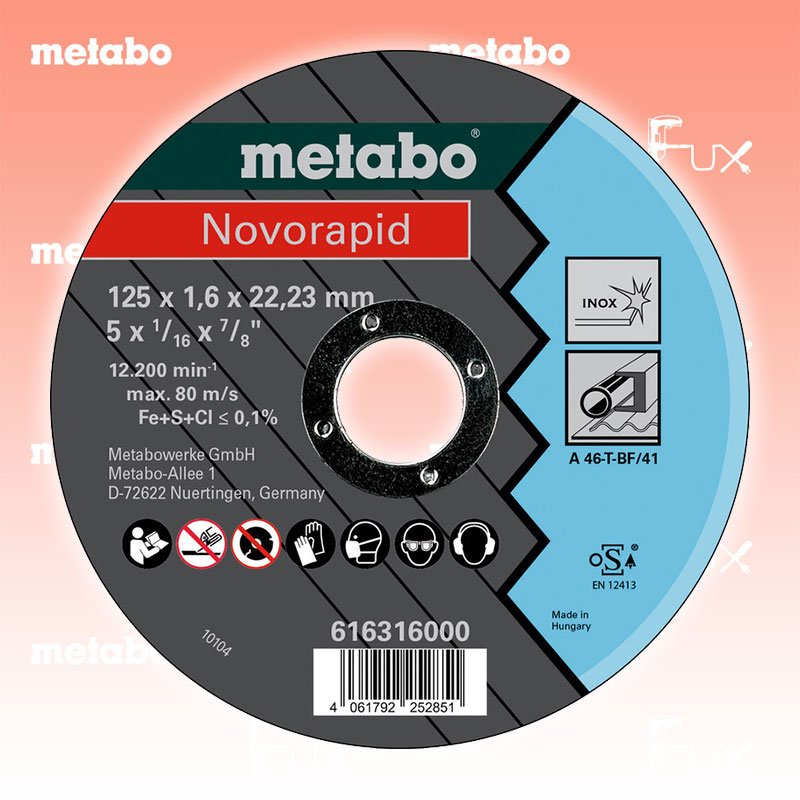Zu "Qualitätsklasse A 46-T Trennscheiben" von Metabo Metabo Trennscheibe Stahl 125 mm Bestell- und Artikelnummer: 616316000 Qualität Novorapid: leistungsstarke Einstiegsklasse Dünne Trennscheibe für die Bearbeitung von rostfreien, dünnwandigen Materialien, wie z.B. Rohre, Bleche, Profile, Drähte usw., als auch für die allgemeine Metallbearbeitung Gute Schnittleistung bei guter Standzeit Härte: hart Geringerer Materialverbrauch, kraftsparend, geringere Maschinenbelastung Eisen-, schwefel- und chlorfrei (Fe + S + Cl ≤ 0,1 %) Arbeitshöchstgeschwindigkeit: 80 m/s Technische Daten Qualitätsklasse A 46-T Durchmesser x Dicke x Bohrung 125 x 1,6 x 22.23 mm Ausführung gerade Max. Drehzahl 12200 Standard-Ausrüstung Verkaufseinheit 25 Stk. Listenpreis CHF 62.50 Fuxpreis CHF 53.00 inkl. 8.1% MwSt, inkl vRG Versand CHF 15.00 Kein Grauimport! Produkt bestellen Verkaufseinheit 25 Stk. 1 Stück 2 Stück 3 Stück 4 Stück 5 Stück 6 Stück 7 Stück 8 Stück 9 Stück 10 Stück 11 Stück 12 Stück 13 Stück 14 Stück 15 Stück 16 Stück 17 Stück 18 Stück 19 Stück 20 Stück 21 Stück 22 Stück 23 Stück 24 Stück 25 Stück 26 Stück 27 Stück 28 Stück 29 Stück 30 Stück 31 Stück 32 Stück 33 Stück 34 Stück 35 Stück 36 Stück 37 Stück 38 Stück 39 Stück 40 Stück 41 Stück 42 Stück 43 Stück 44 Stück 45 Stück 46 Stück 47 Stück 48 Stück 49 Stück 50 Stück Alle Angaben ohne Gewähr und solange Vorrat reicht!Wiederverkäufer werden?Lehrlingsrabatt? Produkt als PDF AKTION 15%