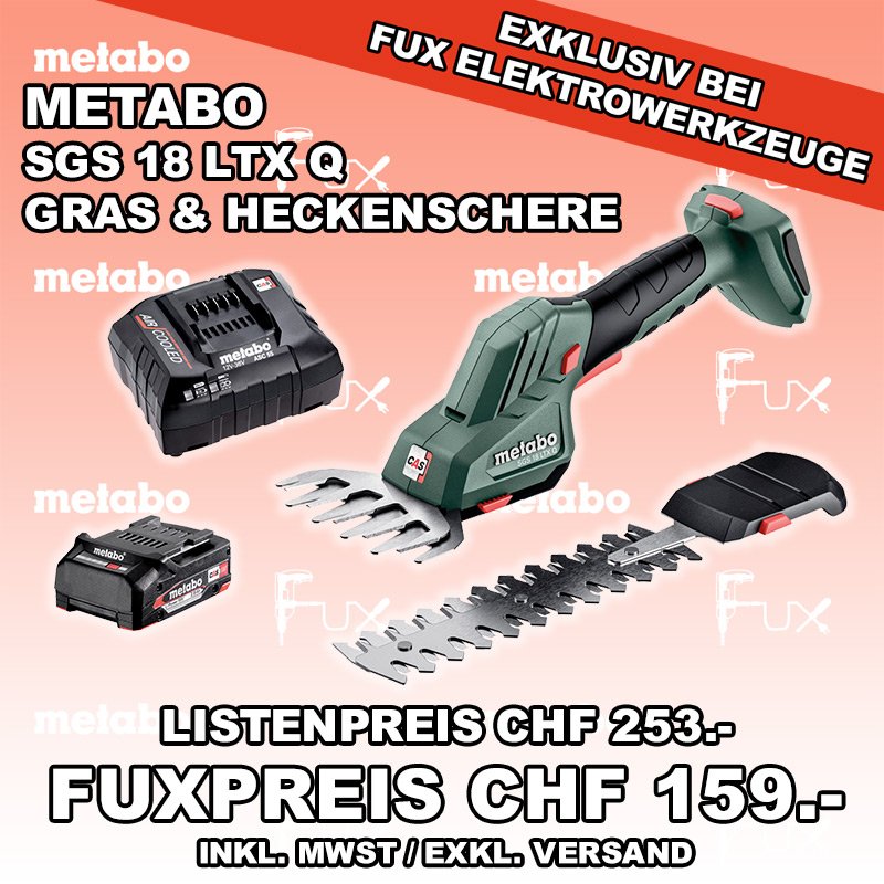 Zu "Akku Gras & Heckenschere" von Metabo FULL Service: 36 Monate zum Nulltarif für Sie! Weitere Infos zum FULL Service Dieses Produkt ist CAS kompatibel! Weitere Infos zu CAS FUX SPECIAL EXKLUSIV BEI FUX Metabo SGS 18 LTX Q Gras & Heckenschere Bestell- und Artikelnummer: 601609840 SET SGS 18 LTX Q Gras & HeckenschereAkkuspannung 18 V Strauchmesser Schnittlänge 20 cm Strauchmesser Schnittstärke 8 mm Grasmesser Schnittbreite 11,5 cmInfos 18 V, 2,0 Ah, Li-Power Akkupack18 V 2.0 Ah ( Li-Ion Akkus ) Infos ASC 55, 12 - 36 V "Air Cooled" LadegerätZum Aufladen aller Li-Power Schiebesitz-Akkupacks (12 V - 36 V). Max. Ladestrom 3 / 4 AInfos Standard-Ausrüstung In diesem Set enthalten: SGS 18 LTX Q Gras & Heckenschere 18 V, 2,0 Ah, Li-Power Akkupack ASC 55, 12 - 36 V "Air Cooled" Ladegerät Strauchmesser metaBOX 145 L Grasmesser Aufbewahrungsschuber Geliefert im Koffer Zubehör Verbrauchsmaterial Listenpreis CHF 273.00 Fuxpreis CHF 159.00 inkl. 8.1% MwSt, inkl vRG Versand CHF 15.00 Kein Grauimport! Produkt bestellen 1 Stück 2 Stück 3 Stück 4 Stück 5 Stück 6 Stück 7 Stück 8 Stück 9 Stück 10 Stück Alle Angaben ohne Gewähr und solange Vorrat reicht!Wiederverkäufer werden? Produkt als PDFVideo LiHD 1Video LiHD 2 AKTION 41%
