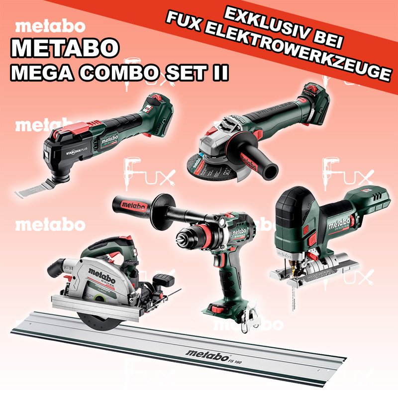 Zu "Combo Set 18 Volt " von Metabo FULL Service: 36 Monate zum Nulltarif für Sie! Weitere Infos zum FULL Service Dieses Produkt ist CAS kompatibel! Weitere Infos zu CAS FUX SPECIAL EXKLUSIV BEI FUX Metabo Mega Combo Set 2 SOLO Bestell- und Artikelnummer: Mega Combo Set 2 SOLO STA 18 LTX 150 BL Akku-StichsägeAkkuspannung 18 V Hubzahl 1.000-3.500 /min Gewicht ohne Akkupack 1.9 kgInfos BS 18 LTX BL Q I Akku-BohrschrauberAkkuspannung 18 V Drehzahl 0-550 / 0-2000 U/min Drehmoment hart / weich 130 / 65 Nm Gewicht (mit Akkupack) 2.3 kgInfos MT 18 LTX BL QSL Akku-Multitool Akkuspannung 18 V Schwingzahl bei Leerlauf 8.000 - 20.000 /min Schleifplatte, Maß Eck zu Eck 93 mm Gewicht 1.7 kgInfos WVB 18 LT BL 11-125 Quick Akku-WinkelschleiferAkkuspannung 18 V Drehzahl 2.800 - 10.000 / min Ø 125 mm Scheiben Gewicht (mit Akkupack) 2.5 kgInfos KS 18 LTX 66 BL Akku HandkreissägeAkkuspannung 18 V Schnitt-Tiefe bei 90° 0-66 mm Sägeblatt 165 mm Gewicht 4.5 kgInfos FS 160 FührungsschieneGesamtlänge 1600 mmInfos Registriere die in diesem Set vorhandenen Metabo Maschinen auf metabo.ch, und ergattere dir bis zu 5 Gratis Akkus!Zusätzlich offerieren wir zu diesem Set einen Gratis Akku!OHNE AKKUS UND LADEGERÄT Standard-Ausrüstung In diesem Set enthalten: STA 18 LTX 150 BL Akku-Stichsäge BS 18 LTX BL Q I Akku-Bohrschrauber MT 18 LTX BL QSL Akku-Multitool WVB 18 LT BL 11-125 Quick Akku-Winkelschleifer KS 18 LTX 66 BL Akku Handkreissäge FS 160 Führungsschiene Zubehör Verbrauchsmaterial Listenpreis CHF 1'909.50 Fuxpreis CHF 987.00 inklusive 8.1% MwSt Versand CHF 30.00 Kein Grauimport! Produkt bestellen 1 Stück 2 Stück 3 Stück 4 Stück 5 Stück 6 Stück 7 Stück 8 Stück 9 Stück 10 Stück Alle Angaben ohne Gewähr und solange Vorrat reicht!Wiederverkäufer werden? Produkt als PDFVideo LiHD 1Video LiHD 2 AKTION 48%