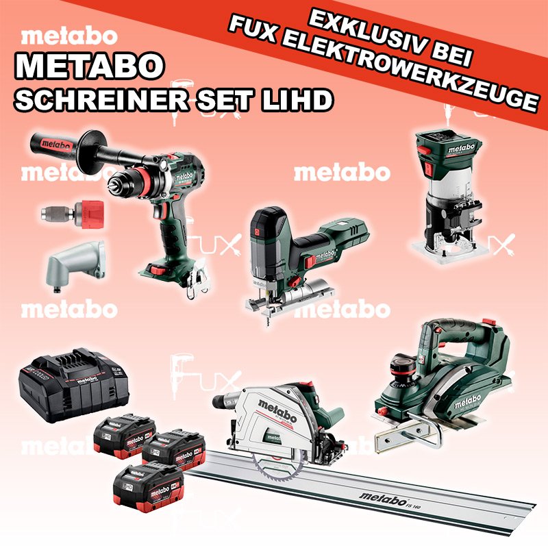 Zu "Schreiner Set" von Metabo FULL Service: 36 Monate zum Nulltarif für Sie! Weitere Infos zum FULL Service Dieses Produkt ist CAS kompatibel! Weitere Infos zu CAS FUX SPECIAL EXKLUSIV BEI FUX Metabo Schreiner Set 4 LiHD Bestell- und Artikelnummer: Schreiner Set 4 LiHD ST 18 LT 130 BL Akku-StichsägeAkkuspannung 18 V Hubzahl 1000-3.500 /min Gewicht ohne Akkupack 1.5 kgInfos BS 18 LTX BL Q I Akku-BohrschrauberAkkuspannung 18 V Drehzahl 0-550 / 0-2000 U/min Drehmoment hart / weich 130 / 65 Nm Gewicht (mit Akkupack) 2.3 kgInfos FMV 18 LTX BL 8 Akku Kantenfräse Akkuspannung 18 V Leerlaufdrehzahl 4.800 - 29.000 /min Spannbohrung der Spannzange 6 / 8 mmInfos KT 18 LTX 66 BL Akku TauchkreissägeAkkuspannung 18 V Schnitt-Tiefe bei 90° 0-66 mm Sägeblatt 165 mm Gewicht 5.3 kgInfos HO 18 LTX 20-82 Akku-Einhand-HobelAkkuspannung 18 V Hobelbreite 82 mm Spanabnahme einstellbar 0-2 mm Gewicht 3.5 KgInfos FS 160 FührungsschieneGesamtlänge 1600 mmInfos 3 x 18 V, 5.5 Ah, LiHD Akkupack18 V 5.5 Ah ( LiHD Akkus ) Infos ASC 145, 12 - 36 V "Air Cooled" LadegerätZum Aufladen aller Li-Power Schiebesitz-Akkupacks (12 V - 36 V). Ladestrom 8.0 AInfos Schnellwechselbithalter »Quick«Schnellwechselbithalter »Quick« Geeignet für alle Metabo "Quick" Maschinen Bits mit 1/4 "Außensechskantantrieb Infos Schnellwechselwinkeladapter »Quick«Metabo "Quick" Maschinen mit Spannzange Ø 43 mm Magnetischer Bithalter mit 1/4 "(6,35 mm) SechskantschaftInfos Registriere die in diesem Set vorhandenen Metabo Maschinen auf metabo.ch, und ergattere dir bis zu 5 Gratis Akkus!Zusätzlich offerieren wir zu diesem Set einen Gratis Akku! Standard-Ausrüstung In diesem Set enthalten: ST 18 LT 130 BL Akku-Stichsäge BS 18 LTX BL Q I Akku-Bohrschrauber FMV 18 LTX BL 8 Akku Kantenfräse KT 18 LTX 66 BL Akku Tauchkreissäge HO 18 LTX 20-82 Akku-Einhand-Hobel FS 160 Führungsschiene 3 x 18 V, 5.5 Ah, LiHD Akkupack ASC 145, 12 - 36 V "Air Cooled" Ladegerät Schnellwechselbithalter »Quick« Schnellwechselwinkeladapter »Quick« Zubehör Verbrauchsmaterial Listenpreis CHF 2'521.50 Fuxpreis CHF 1'513.00 inklusive 8.1% MwSt Versand CHF 40.00 Kein Grauimport! Produkt bestellen 1 Stück 2 Stück 3 Stück 4 Stück 5 Stück 6 Stück 7 Stück 8 Stück 9 Stück 10 Stück Alle Angaben ohne Gewähr und solange Vorrat reicht!Wiederverkäufer werden? Produkt als PDFVideo LiHD 1Video LiHD 2 AKTION 40%