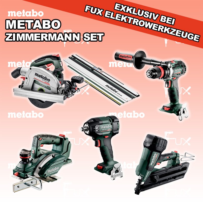 Zu "Zimmermann Set" von Metabo FULL Service: 36 Monate zum Nulltarif für Sie! Weitere Infos zum FULL Service Dieses Produkt ist CAS kompatibel! Weitere Infos zu CAS FUX SPECIAL EXKLUSIV BEI FUX Metabo Zimmermann SET 10 SOLO Bestell- und Artikelnummer: Zimmermann SET 10 SOLO BS 18 LTX BL Q I Akku-BohrschrauberAkkuspannung 18 V Drehzahl 0-550 / 0-2000 U/min Drehmoment hart / weich 130 / 65 Nm Gewicht (mit Akkupack) 2.3 kgInfos SSW 18 LTX 550 BL Akku-SchlagschrauberAkkuspannung 18 V Anziehdrehmoment 550 Nm Werkzeugaufnahme 1/2" Gewicht ohne Akkupack 1,4 kgInfos NFR 18 LTX 90 BL Akku NaglerAkkuspannung 18 V Nagelstreifen Winkel 30 - 34 ° Nagellänge 50 - 90 mm Nageldurchmesser 2,9 - 3,3 mm Gewicht ohne Akkupack 4,1 kgInfos HO 18 LTX 20-82 Akku-Einhand-HobelAkkuspannung 18 V Hobelbreite 82 mm Spanabnahme einstellbar 0-2 mm Gewicht 3.5 KgInfos KS 18 LTX 66 BL Akku HandkreissägeAkkuspannung 18 V Schnitt-Tiefe bei 90° 0-66 mm Sägeblatt 165 mm Gewicht 4.5 kgInfos Kappschiene KFS 44Gesamtlänge 834 mm Schnittlänge 440 mmInfos Registriere die in diesem Set vorhandenen Metabo Maschinen auf metabo.ch, und ergattere dir bis zu 5 Gratis Akkus!Zusätzlich offerieren wir zu diesem Set einen Gratis Akku!OHNE AKKUS UND LADEGERÄT Standard-Ausrüstung In diesem Set enthalten: BS 18 LTX BL Q I Akku-Bohrschrauber SSW 18 LTX 550 BL Akku-Schlagschrauber NFR 18 LTX 90 BL Akku Nagler HO 18 LTX 20-82 Akku-Einhand-Hobel KS 18 LTX 66 BL Akku Handkreissäge Kappschiene KFS 44 Listenpreis CHF 2'253.50 Fuxpreis CHF 1'629.00 inklusive 8.1% MwSt Versand CHF 25.00 Kein Grauimport! Produkt bestellen 1 Stück 2 Stück 3 Stück 4 Stück 5 Stück 6 Stück 7 Stück 8 Stück 9 Stück 10 Stück Alle Angaben ohne Gewähr und solange Vorrat reicht!Wiederverkäufer werden? Produkt als PDF NEUHEITAKTION 27%
