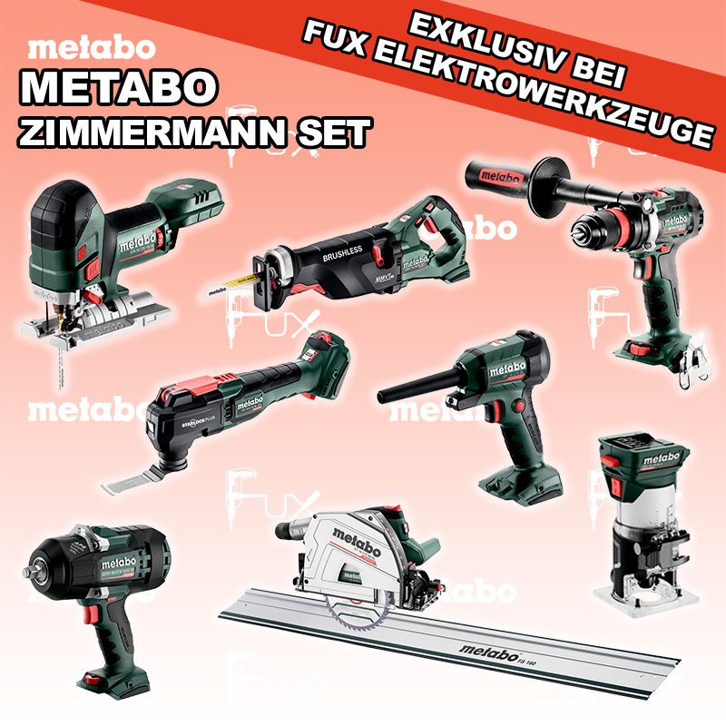 Zu "Zimmermann Set" von Metabo FULL Service: 36 Monate zum Nulltarif für Sie! Weitere Infos zum FULL Service Dieses Produkt ist CAS kompatibel! Weitere Infos zu CAS FUX SPECIAL EXKLUSIV BEI FUX Metabo Zimmermann SET XXL SOLO Bestell- und Artikelnummer: Zimmermann SET XXL SOLO BS 18 LTX BL Q I Akku-BohrschrauberAkkuspannung 18 V Drehzahl 0-550 / 0-2000 U/min Drehmoment hart / weich 130 / 65 Nm Gewicht (mit Akkupack) 2.3 kgInfos STA 18 LTX 150 BL Akku-StichsägeAkkuspannung 18 V Hubzahl 1.000-3.500 /min Gewicht ohne Akkupack 1.9 kgInfos MT 18 LTX BL QSL Akku-Multitool Akkuspannung 18 V Schwingzahl bei Leerlauf 8.000 - 20.000 /min Schleifplatte, Maß Eck zu Eck 93 mm Gewicht 1.7 kgInfos SSW 18 LTX 1450 BL Akku-SchlagschrauberAkkuspannung 18 V Anziehdrehmoment 1450 Nm Werkzeugaufnahme 1/2" Infos KS 18 LTX 66 BL Akku HandkreissägeAkkuspannung 18 V Schnitt-Tiefe bei 90° 0-66 mm Sägeblatt 165 mm Gewicht 4.5 kgInfos MS 36-18 LTX BL 40 Akku KettensägeAkkuspannung 18 V Schnittlänge 36 cm Max. Kettengeschwindigkeit 22 m/s Gewicht mit Akkupack 4,6 kgInfos SSEP 18 LTX BL MVT Akku-SäbelsägeAkkuspannung 18 V Hubzahl bei Leerlauf 0 - 3.000 /min Gewicht (mit Akkupack) 4.6 kgInfos BP 18 LTX BL Akku Blaspistole Akkuspannung 18 V Luftmenge 0,7 m 3/min Max. Luftgeschwindigkeit 122 m/sInfos FMV 18 LTX BL 8 Akku Kantenfräse Akkuspannung 18 V Leerlaufdrehzahl 4.800 - 29.000 /min Spannbohrung der Spannzange 6 / 8 mmInfos FS 160 FührungsschieneGesamtlänge 1600 mmInfos Registriere die in diesem Set vorhandenen Metabo Maschinen auf metabo.ch, und ergattere dir bis zu 5 Gratis Akkus!Zusätzlich offerieren wir zu diesem Set einen Gratis Akku!OHNE AKKUS UND LADEGERÄT Standard-Ausrüstung In diesem Set enthalten: BS 18 LTX BL Q I Akku-Bohrschrauber STA 18 LTX 150 BL Akku-Stichsäge MT 18 LTX BL QSL Akku-Multitool SSW 18 LTX 1450 BL Akku-Schlagschrauber KS 18 LTX 66 BL Akku Handkreissäge MS 36-18 LTX BL 40 Akku Kettensäge SSEP 18 LTX BL MVT Akku-Säbelsäge BP 18 LTX BL Akku Blaspistole FMV 18 LTX BL 8 Akku Kantenfräse FS 160 Führungsschiene Listenpreis CHF 3'285.50 Fuxpreis CHF 2'236.00 inklusive 8.1% MwSt Versand CHF 25.00 Kein Grauimport! Produkt bestellen 1 Stück 2 Stück 3 Stück 4 Stück 5 Stück 6 Stück 7 Stück 8 Stück 9 Stück 10 Stück Alle Angaben ohne Gewähr und solange Vorrat reicht!Wiederverkäufer werden? Produkt als PDF NEUHEITAKTION 31%