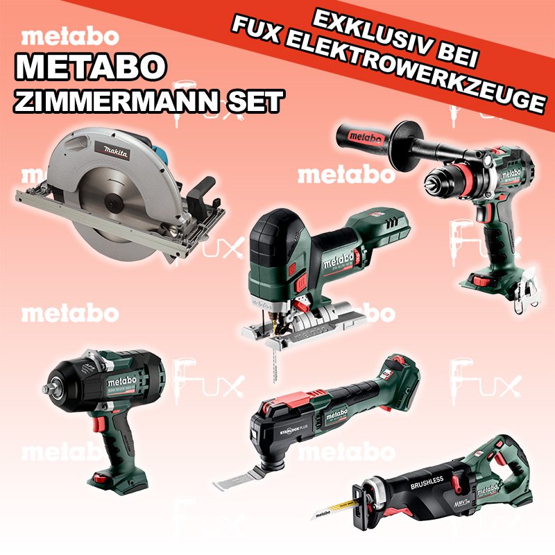 Zu "Zimmermann Set" von Metabo FULL Service: 36 Monate zum Nulltarif für Sie! Weitere Infos zum FULL Service Dieses Produkt ist CAS kompatibel! Weitere Infos zu CAS FUX SPECIAL EXKLUSIV BEI FUX Metabo Zimmermann SET 19 SOLO Bestell- und Artikelnummer: Zimmermann SET 19 SOLO BS 18 LTX BL Q I Akku-BohrschrauberAkkuspannung 18 V Drehzahl 0-550 / 0-2000 U/min Drehmoment hart / weich 130 / 65 Nm Gewicht (mit Akkupack) 2.3 kgInfos SSW 18 LTX 1450 BL Akku-SchlagschrauberAkkuspannung 18 V Anziehdrehmoment 1450 Nm Werkzeugaufnahme 1/2" Infos SSEP 18 LTX BL MVT Akku-SäbelsägeAkkuspannung 18 V Hubzahl bei Leerlauf 0 - 3.000 /min Gewicht (mit Akkupack) 4.6 kgInfos 5143 R HandkreissägeLeistungsaufnahme 2200 Watt 50 - 130 mm Schnitt-Tiefe bei 90° Leerlaufdrehzahl 2700 U/min Gewicht 14.5 kgInfos MT 18 LTX BL QSL Akku-Multitool Akkuspannung 18 V Schwingzahl bei Leerlauf 8.000 - 20.000 /min Schleifplatte, Maß Eck zu Eck 93 mm Gewicht 1.7 kgInfos STA 18 LTX 150 BL Akku-StichsägeAkkuspannung 18 V Hubzahl 1.000-3.500 /min Gewicht ohne Akkupack 1.9 kgInfos Registriere die in diesem Set vorhandenen Metabo Maschinen auf metabo.ch, und ergattere dir bis zu 5 Gratis Akkus!Zusätzlich offerieren wir zu diesem Set einen Gratis Akku!OHNE AKKUS UND LADEGERÄT Standard-Ausrüstung In diesem Set enthalten: BS 18 LTX BL Q I Akku-Bohrschrauber SSW 18 LTX 1450 BL Akku-Schlagschrauber SSEP 18 LTX BL MVT Akku-Säbelsäge 5143 R Handkreissäge MT 18 LTX BL QSL Akku-Multitool STA 18 LTX 150 BL Akku-Stichsäge Listenpreis CHF 3'054.00 Fuxpreis CHF 2'112.00 inklusive 8.1% MwSt Versand CHF 25.00 Kein Grauimport! Produkt bestellen 1 Stück 2 Stück 3 Stück 4 Stück 5 Stück 6 Stück 7 Stück 8 Stück 9 Stück 10 Stück Alle Angaben ohne Gewähr und solange Vorrat reicht!Wiederverkäufer werden? Produkt als PDF NEUHEITAKTION 30%