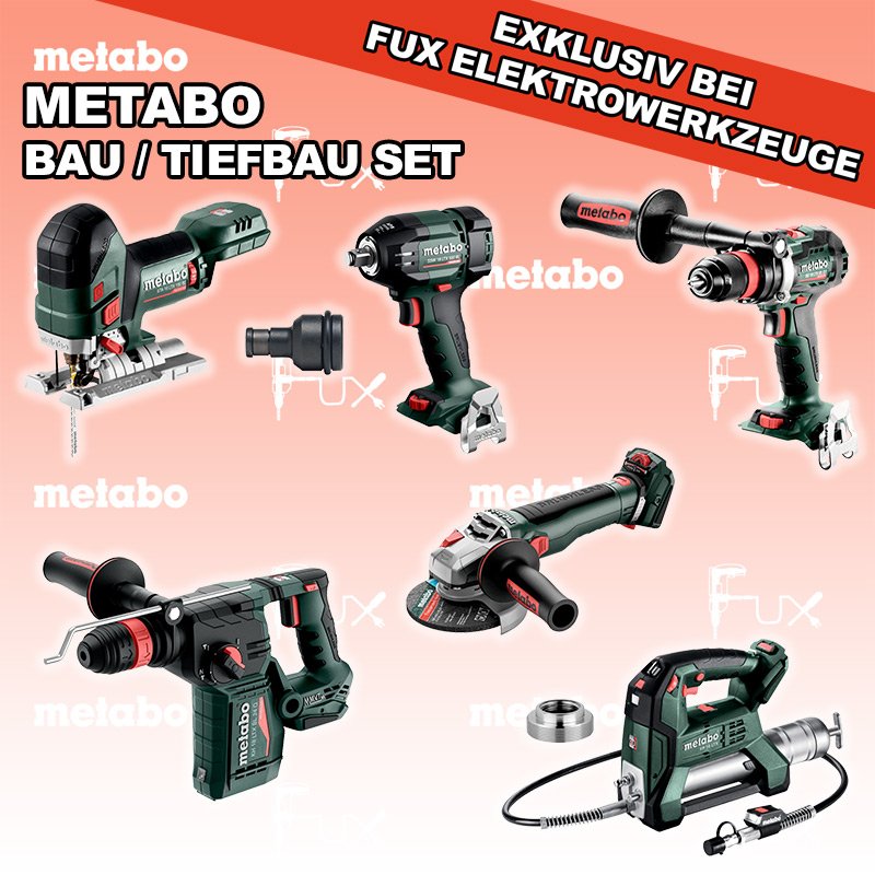 Zu "Bau / Tiefbau Set" von Metabo FULL Service: 36 Monate zum Nulltarif für Sie! Weitere Infos zum FULL Service FUX SPECIAL EXKLUSIV BEI FUX Metabo Bau / Tiefbau Set 2 SOLO Bestell- und Artikelnummer: Bau / Tiefbau Set 2 SOLO BS 18 LTX BL Q I Akku-BohrschrauberAkkuspannung 18 V Drehzahl 0-550 / 0-2000 U/min Drehmoment hart / weich 130 / 65 Nm Gewicht (mit Akkupack) 2.3 kgInfos STA 18 LTX 150 BL Akku-StichsägeAkkuspannung 18 V Hubzahl 1.000-3.500 /min Gewicht ohne Akkupack 1.9 kgInfos KH 18 LTX BL 24 Q Akku-KombihammerAkkuspannung 18 V Einzelschlagstärke 2.2 J Bohrleistung in Beton 24 mm Gewicht ohne Akkupack 3 kgInfos WVB 18 LT BL 11-125 Quick Akku-WinkelschleiferAkkuspannung 18 V Drehzahl 2.800 - 10.000 / min Ø 125 mm Scheiben Gewicht (mit Akkupack) 2.5 kgInfos SSW 18 LTX 550 BL Akku-SchlagschrauberAkkuspannung 18 V Anziehdrehmoment 550 Nm Werkzeugaufnahme 1/2" Gewicht ohne Akkupack 1,4 kgInfos Adapter mit 1/2“ auf 1/4"Adapter mit 1/2“ Innenvierkant maschinenseitig und 1/4“ Innensechskant für schlagfeste Einsatzwerkzeuge mit 1/4“ SchaftInfos FP 18 LTX Akku FettpresseAkkuspannung 18 V Maximaler Druck 690 bar Auspressgeschwindigkeit 100 / 290 ml/min Gewicht inkl. Akku 4.4 kgInfos Adapter für Lube-Shuttle® 400GAdapter zum Umrüsten von Fettbehälter auf Lube-Shuttle®* Kartusche 400g geeignet für FP 18 LTXInfos Registriere die in diesem Set vorhandenen Metabo Maschinen auf metabo.ch, und ergattere dir bis zu 5 Gratis Akkus!Zusätzlich offerieren wir zu diesem Set einen Gratis Akku!OHNE AKKUS UND LADEGERÄT Standard-Ausrüstung In diesem Set enthalten: BS 18 LTX BL Q I Akku-Bohrschrauber STA 18 LTX 150 BL Akku-Stichsäge KH 18 LTX BL 24 Q Akku-Kombihammer WVB 18 LT BL 11-125 Quick Akku-Winkelschleifer SSW 18 LTX 550 BL Akku-Schlagschrauber Adapter mit 1/2“ auf 1/4" FP 18 LTX Akku Fettpresse Adapter für Lube-Shuttle® 400G Listenpreis CHF 2'182.50 Fuxpreis CHF 1'491.00 inklusive 8.1% MwSt Frankolieferung Kein Grauimport! Produkt bestellen 1 Stück 2 Stück 3 Stück 4 Stück 5 Stück 6 Stück 7 Stück 8 Stück 9 Stück 10 Stück Alle Angaben ohne Gewähr und solange Vorrat reicht!Wiederverkäufer werden? Produkt als PDF NEUHEITAKTION 31%